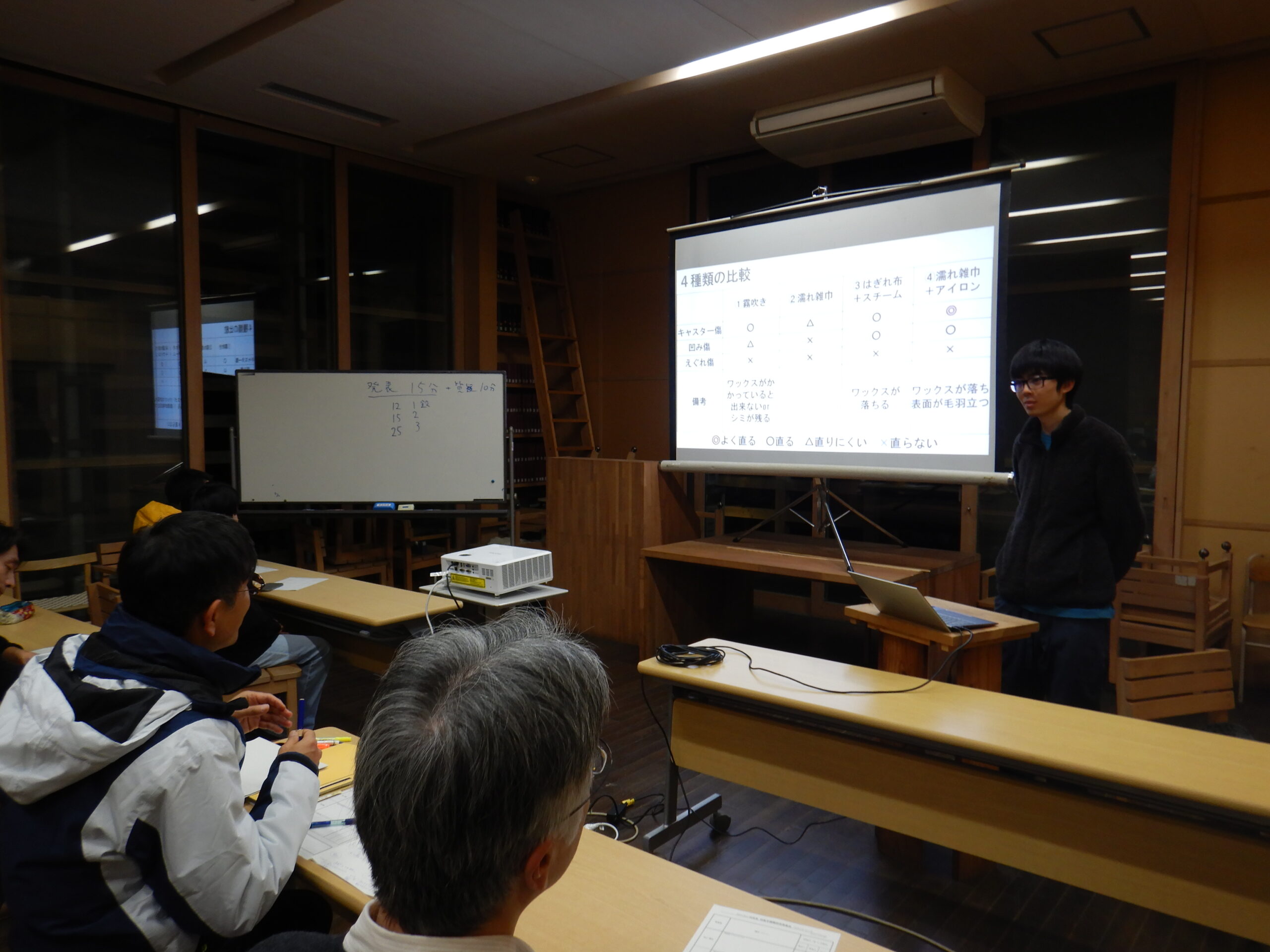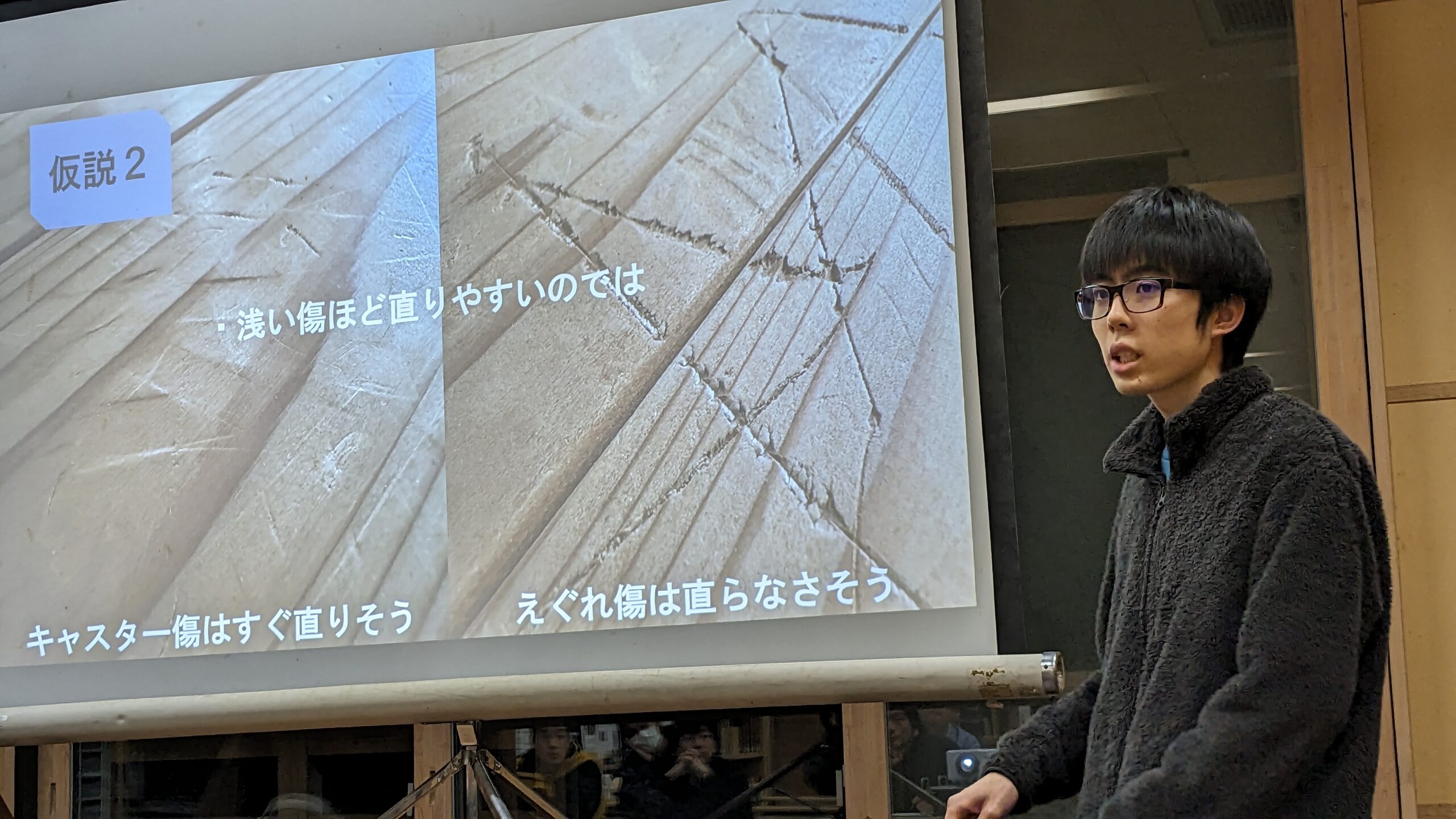自室の床を材料に「傷の直し方」を実験した結果について発表しました。