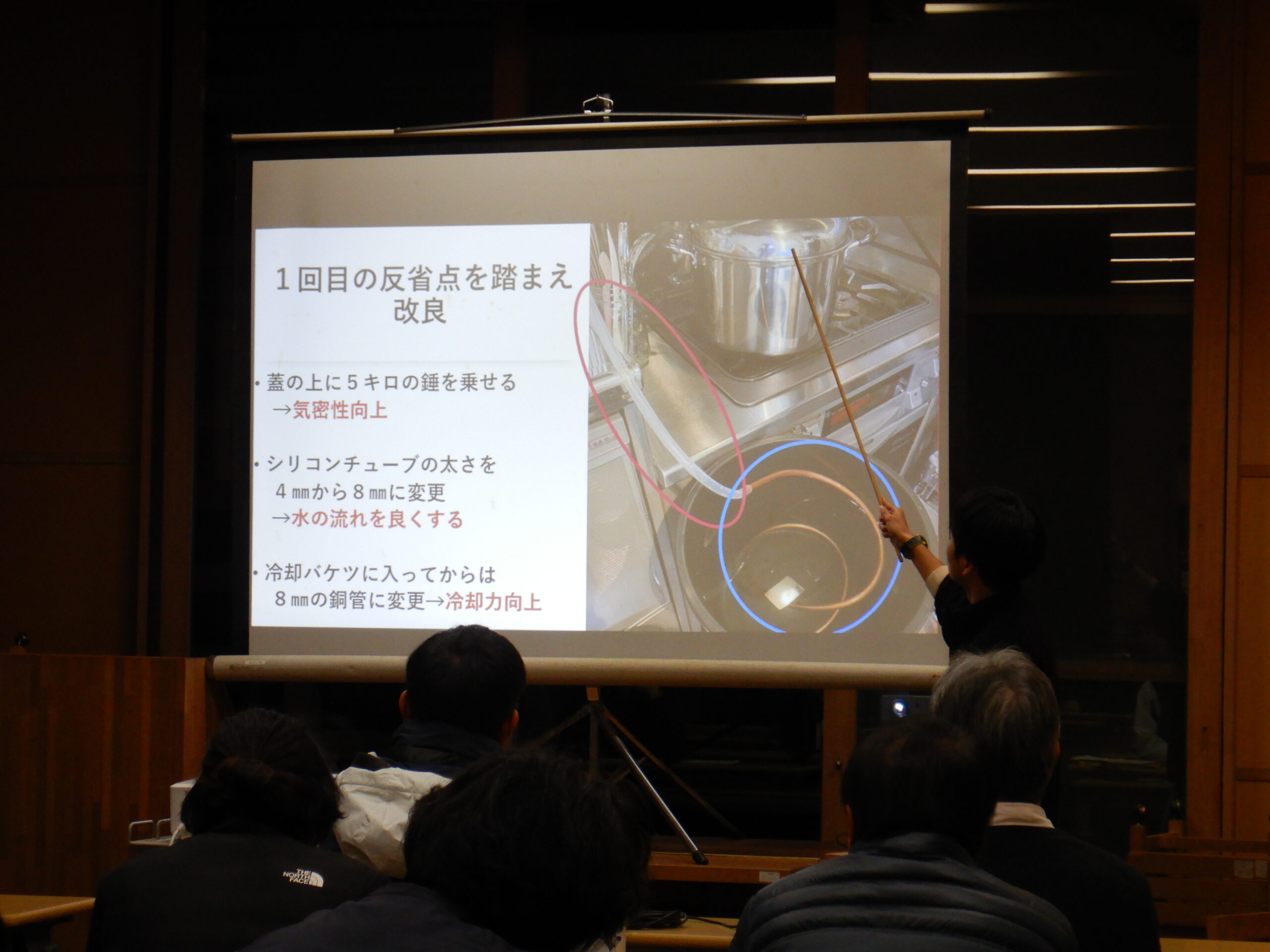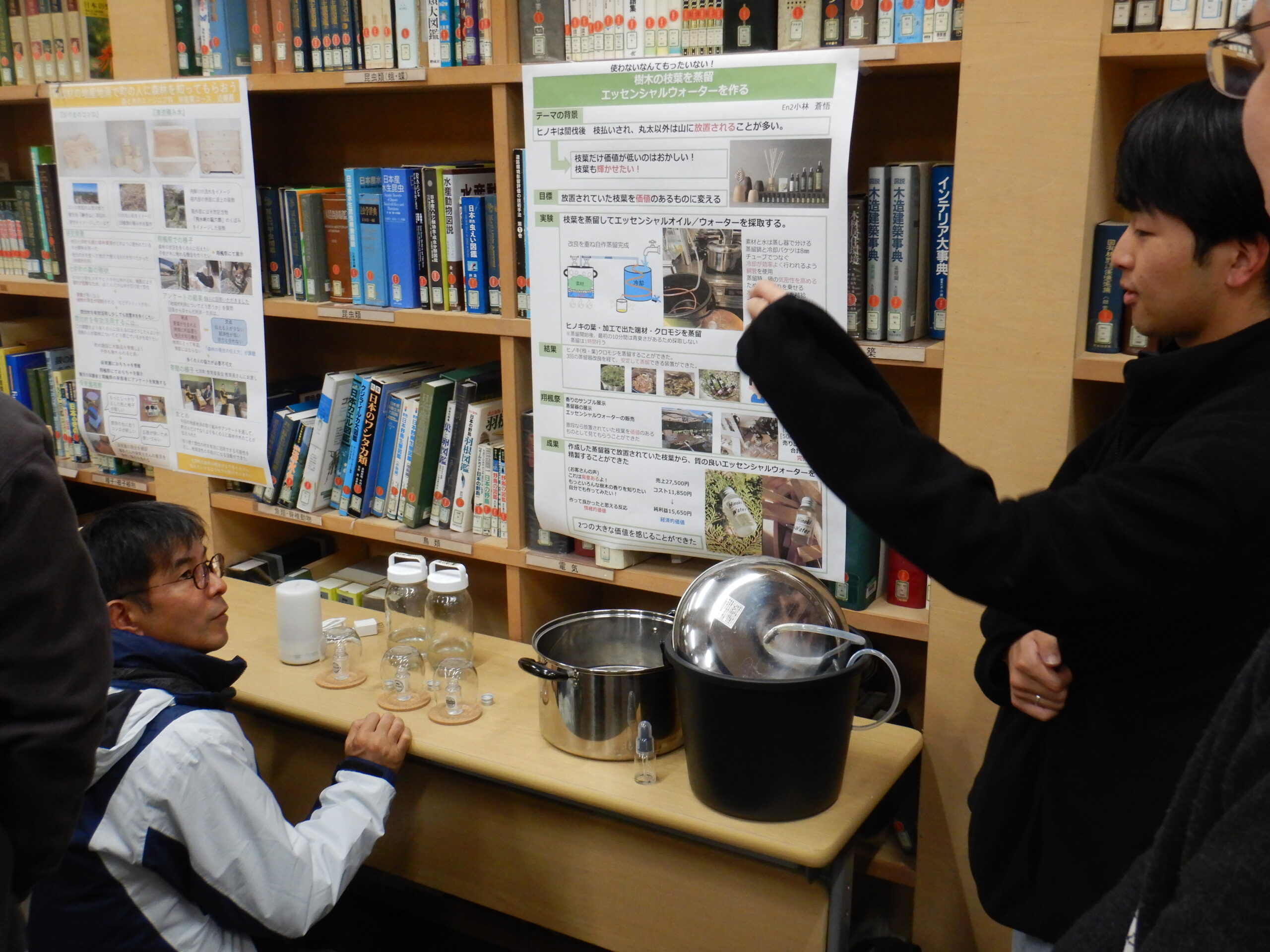 趣味のアロマにヒントを得て、葉からエッセンシャルウォーターを蒸留できる蒸留器の開発を自ら試行錯誤し、求める結果へ至った経緯を発表しています。
