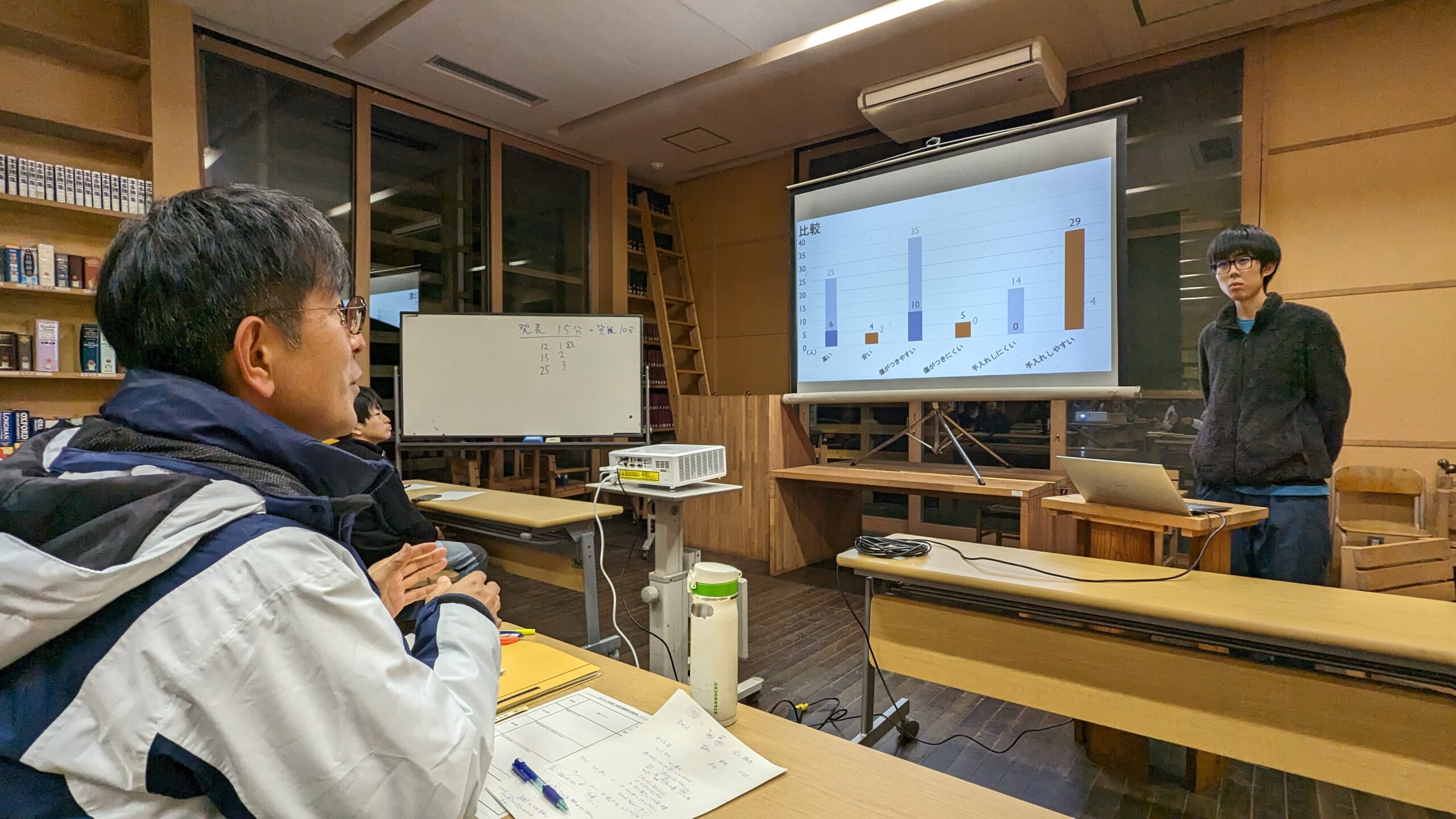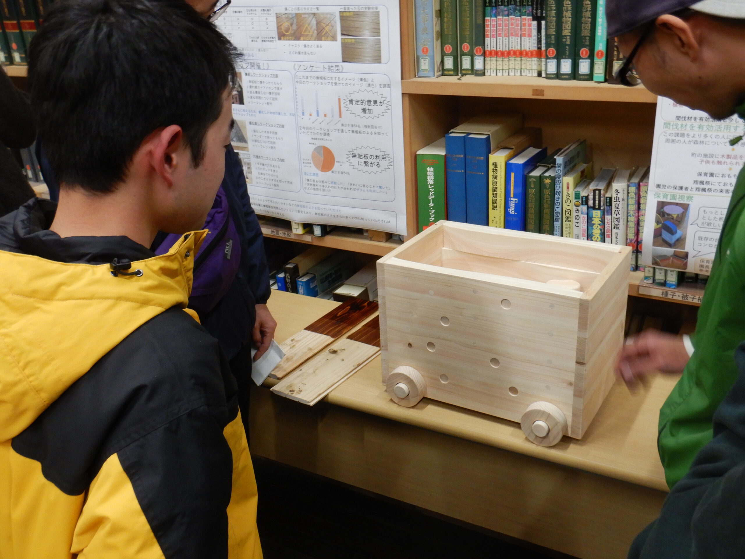 翔楓祭で行った作品展示や、翔楓祭の来場者や保育園の保護者の方々に対して行った森林や地域材利用に関するアンケートの結果から見えてきたことについても報告がありました。