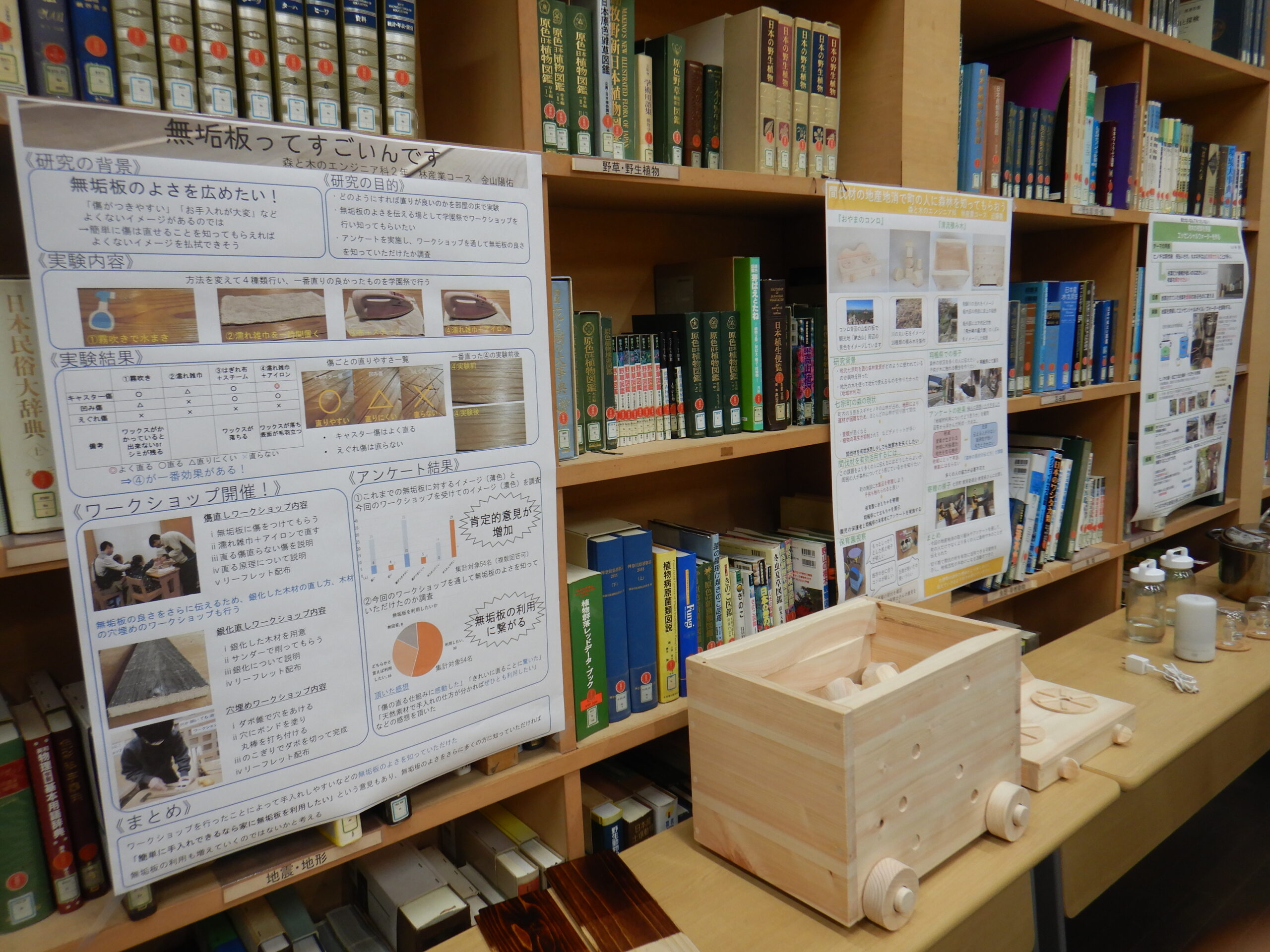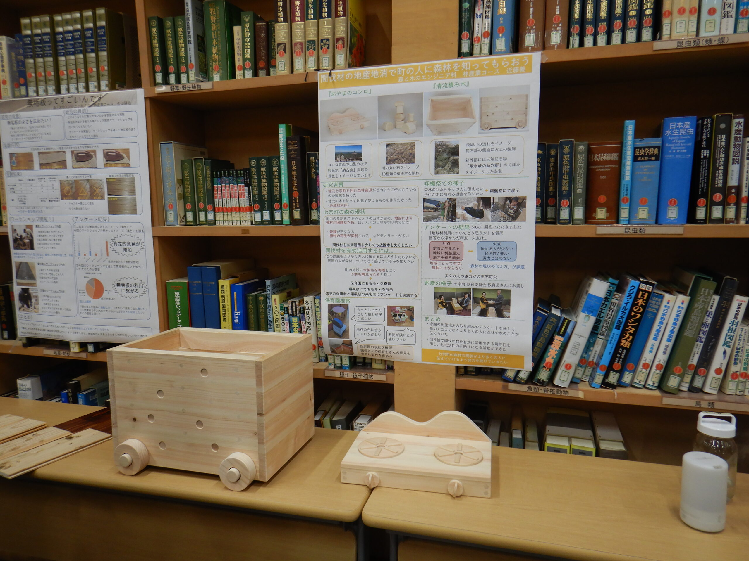 地域の森林組合に丸太の提供をお願いし町役場・保育園にヒアリングを行うなど、地域の人とつながりながら、町の森林の現状や保育園で求められるおもちゃについて考え、材料の準備と加工・設計図の作製・おもちゃの製作を自らの手で行い、保育園へ寄贈した成果について発表しました。