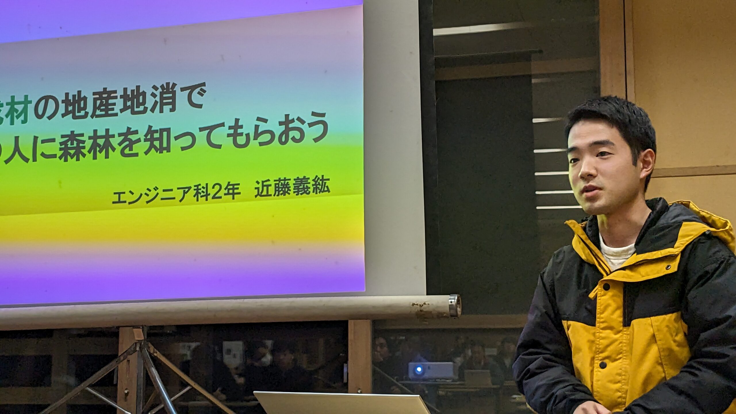 二番手、近藤さんの発表は「間伐材の地産地消で町の人に森林を知ってもらおう」です。