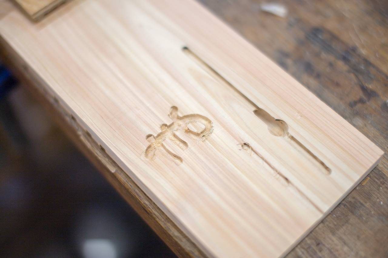 作った冶具を用いて、ルーターを使って、トチの板に掘りこみをしていきます。