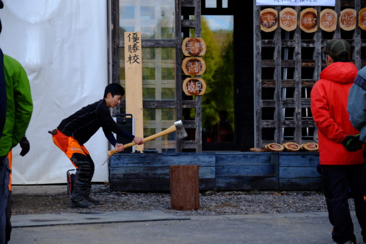 開会式では、昨年優勝校の森林文化アカデミーを代表して、実行委員長の日下部君が斧入れ式を行いました。