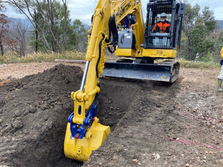 作業道ではありませんが、締固めの試験のため平地で掘削を行っています。一定の深さまで掘り、その後土を入れて転圧していきます。