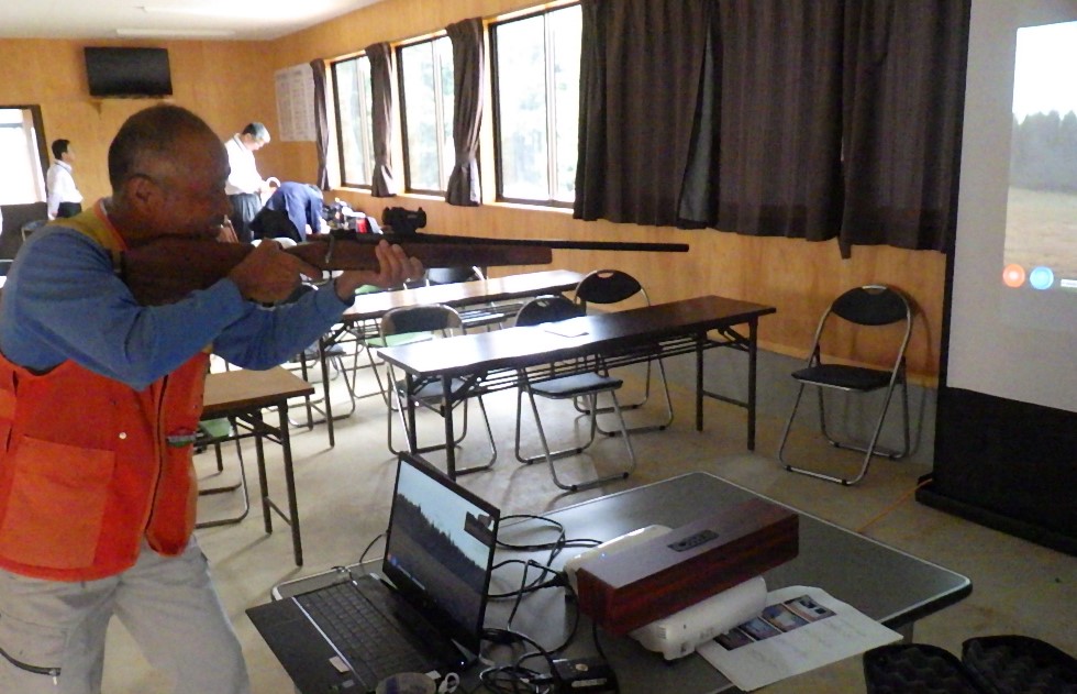 ここでツキノワグマの生態や、まさかの時の応急処置練習、そして実弾射撃(散弾銃スラッグ弾・ライフル)を実施され、その合間にシミュレーターで各々の癖を確認してもらうことで、捕獲率向上を目指してもらいました。