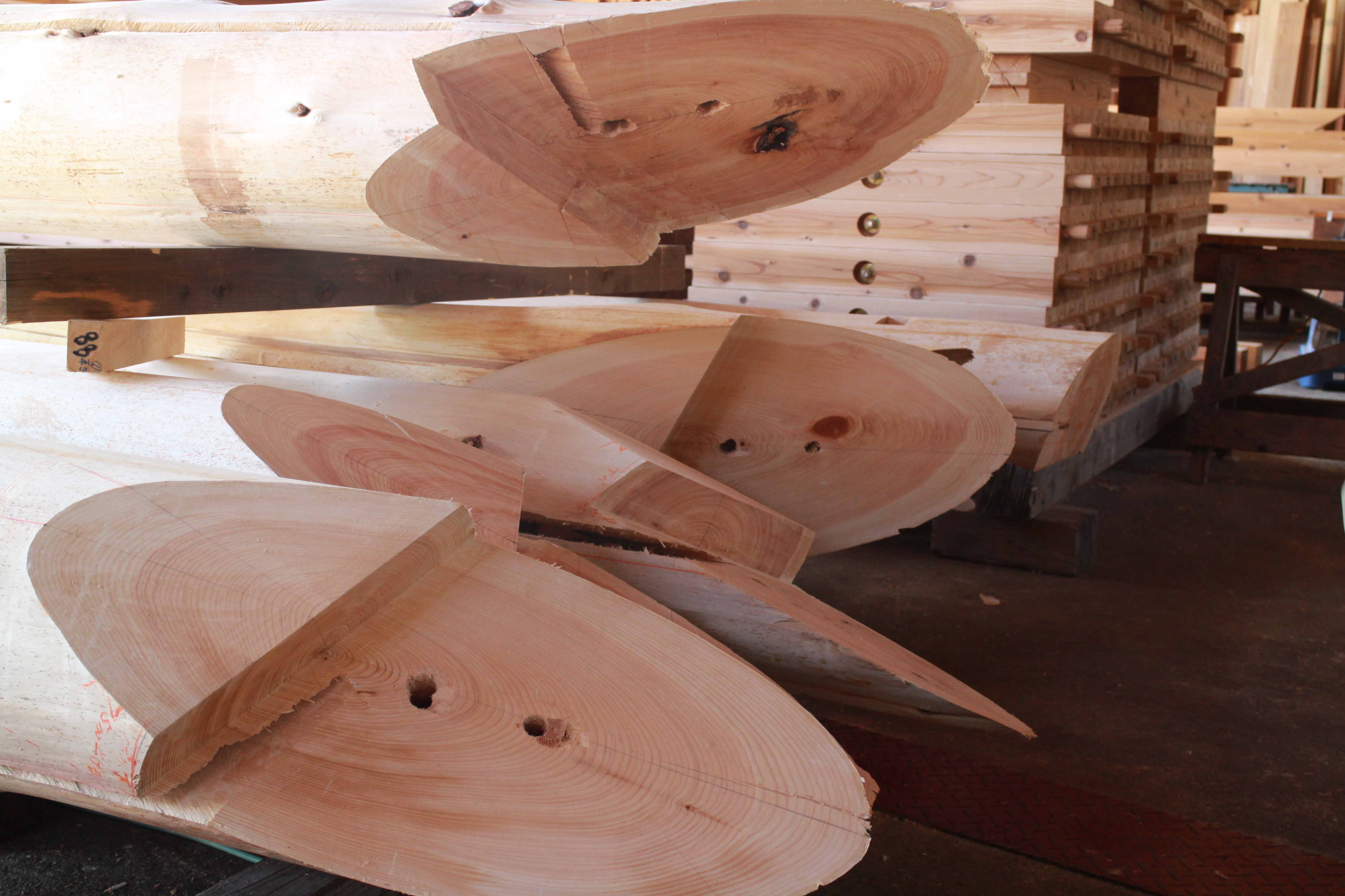 丸太は、建築工事を受注された(株)澤崎建設さんの工場で自社大工さんの手によって行われています。この加工の複雑なこと。大工さんからは「丸太柱が平面でも立面でも斜めになっているうえに、1本1本の丸太の形状が微妙に違う。一筋縄ではいかない。とにかく墨付けまでが一苦労。でも、大工としての腕の見せ所だと思うよ」との感想をいただきました。