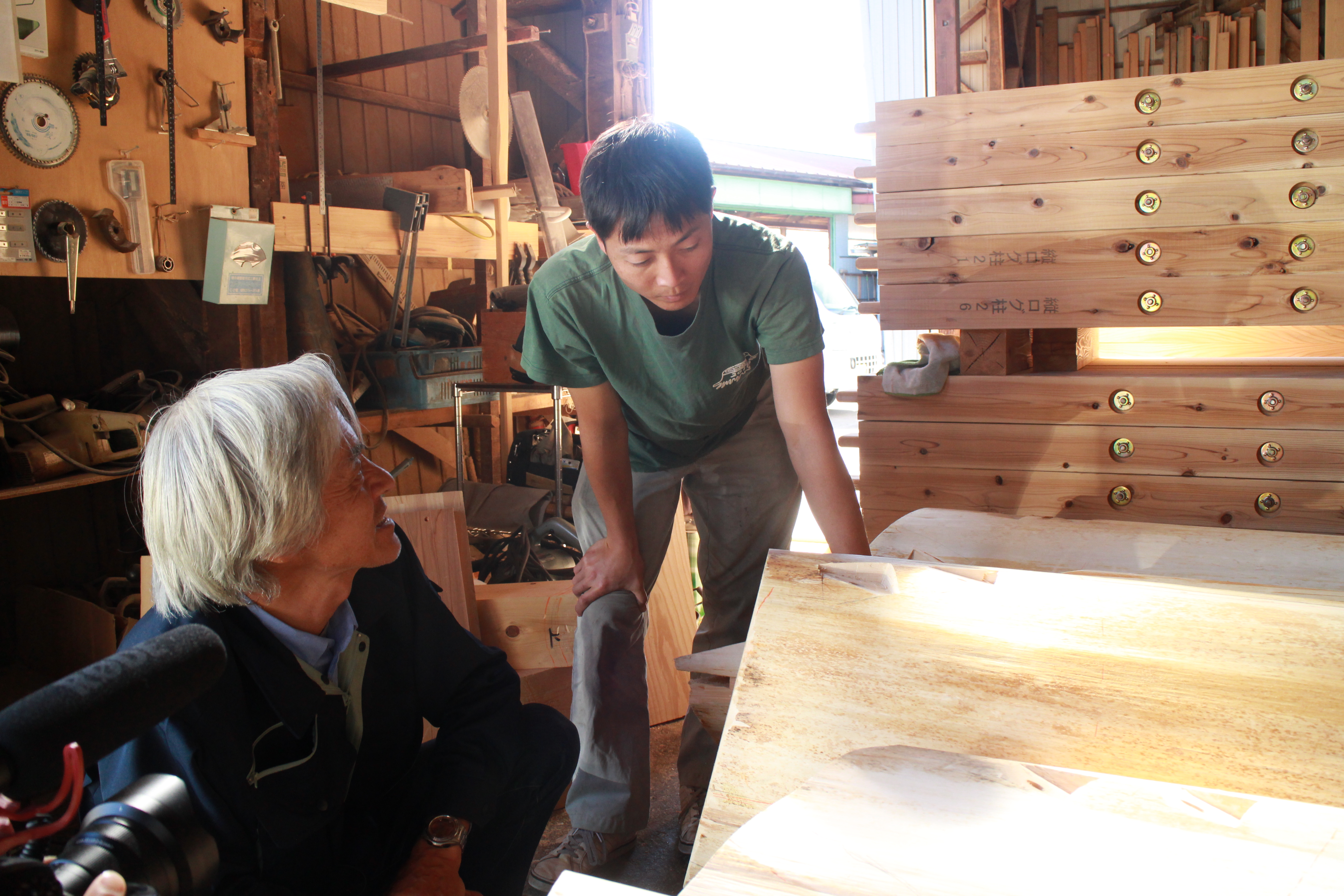 今回は、今年5月に伐採に先立って立木のまま乾燥させる「梶本式立木乾燥法」を指導いただいた梶本先生、アカデミー教員杉本先生とともに、建築工事を受注された(株)澤崎建設さんの工場でヒノキ丸太の加工作業を見せてもらいに行きました。