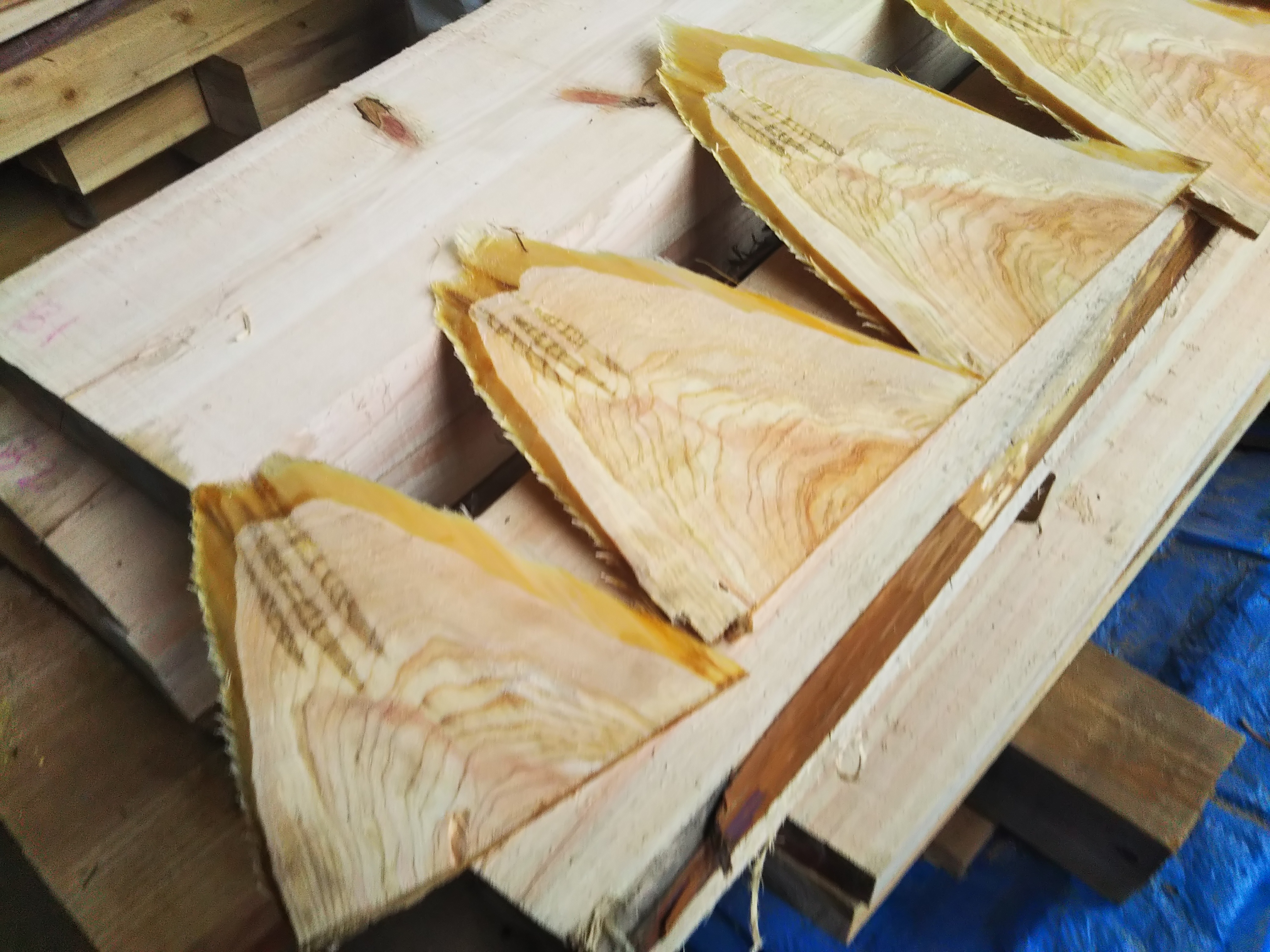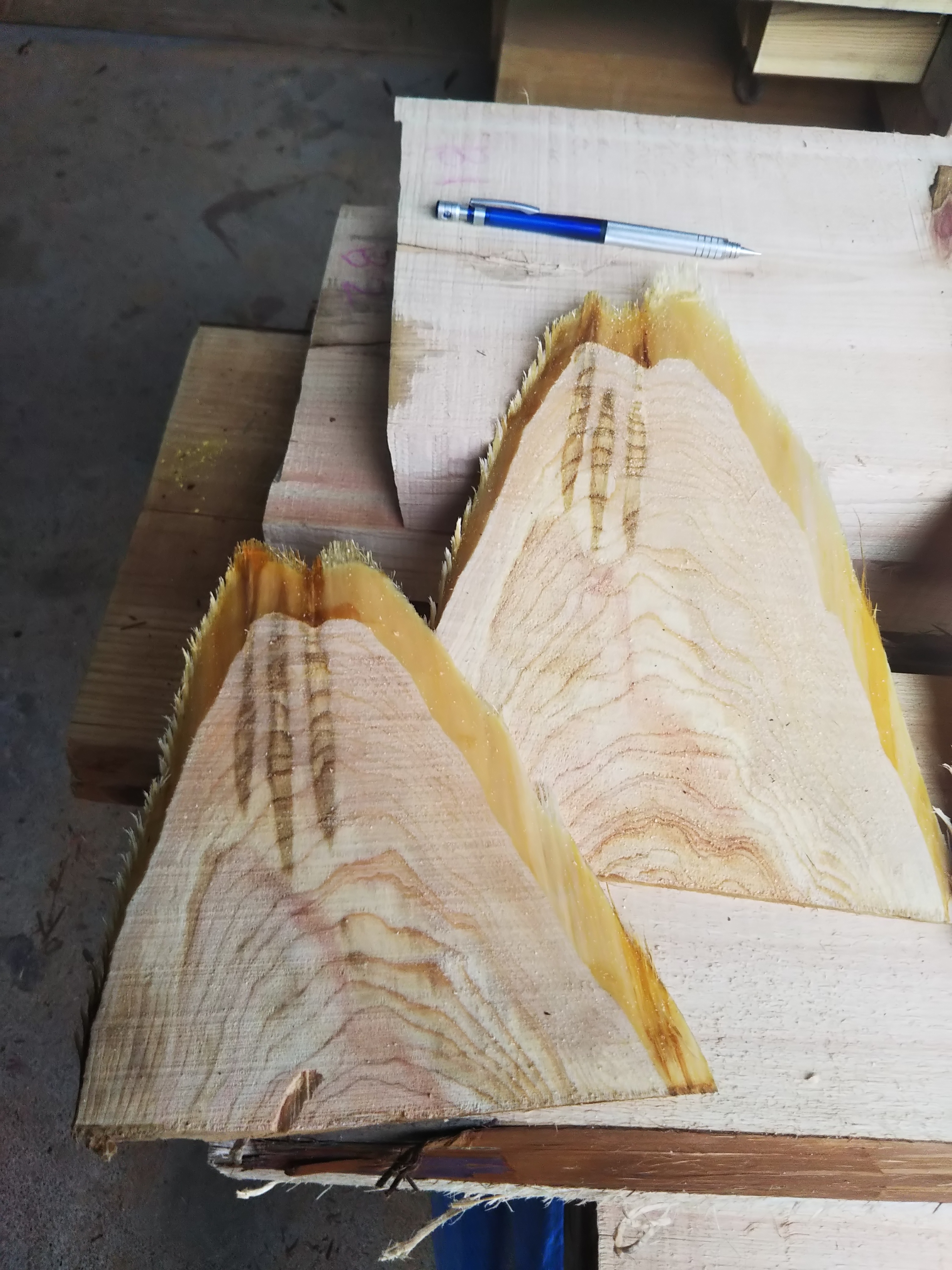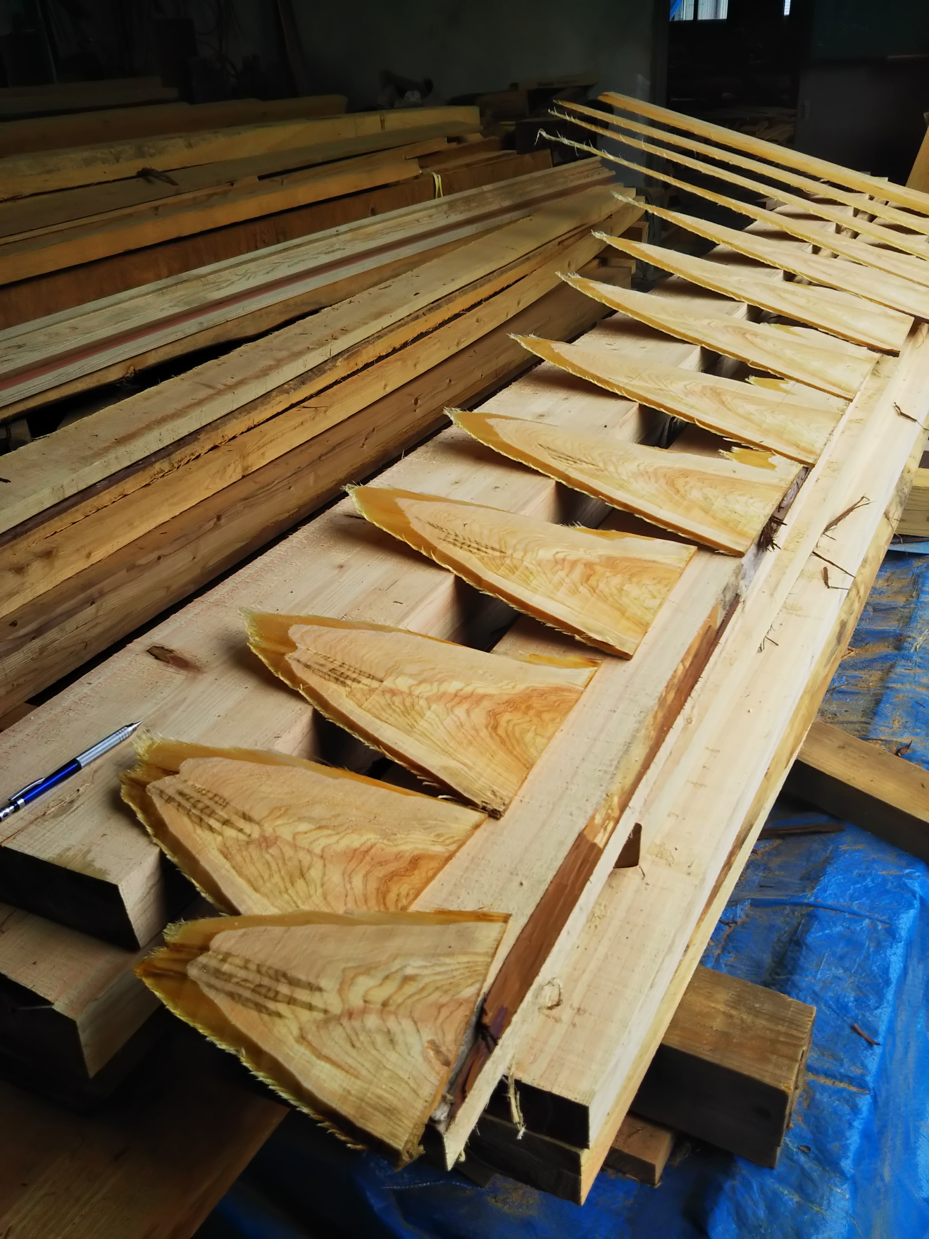 上の写真には2枚の板が映っていまして、板の真ん中の茶色の線は髄(ずい)、髄から横に出ている跡は枝の跡です。一般市場にはなかなか見ない板ですが、樹木の勉強のためにはよい板です。木がどう育ってきたのか、少しわかる気がします!