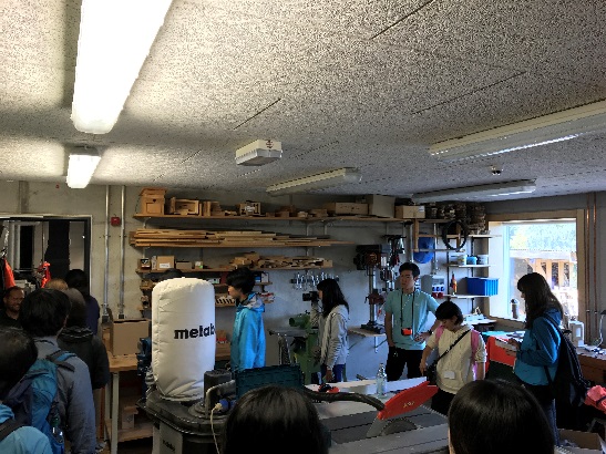 その後、少し移動して研修と宿泊を行う施設を見学しました。立派な塔が印象的な建物で、以前はお城であったとのこと。施設内には、作業で使ったジャケット・靴を乾かすための乾燥室や、木工品やクギをつくるための木工室、施設全体の暖房等を行なっているバイオマスボイラー室、食堂、宿泊用の部屋などがありました。さらには休み時間等にリフレッシュするためのバスケットコートやボルダリング用の壁、卓球台、塔の最上階にはミラーボール付きのパーティルームまでありました。滞在中は、スマートフォンや携帯電話等の使用ができず、各自の家との連絡は学校にある1台の電話機を通してしか行えないとのこと。シュバルツバルトの森に囲まれたお城の中で、少しいつもとは違う環境で自然や仲間と向き合う時間が作れるようになっているのだと思いました。