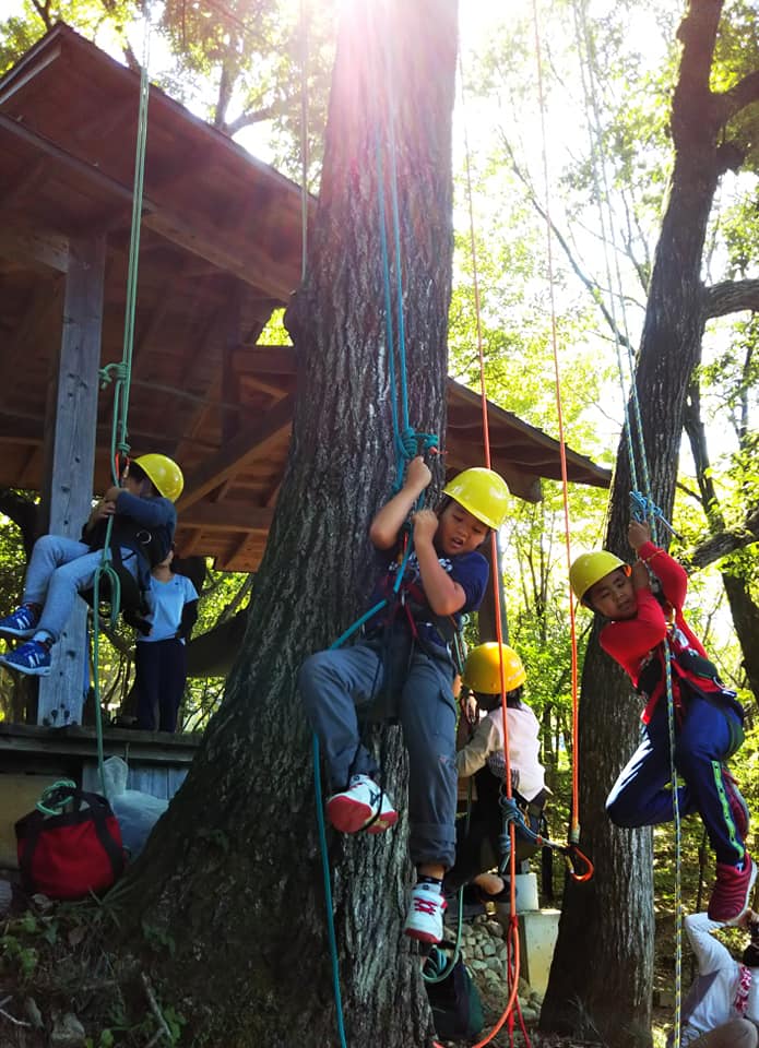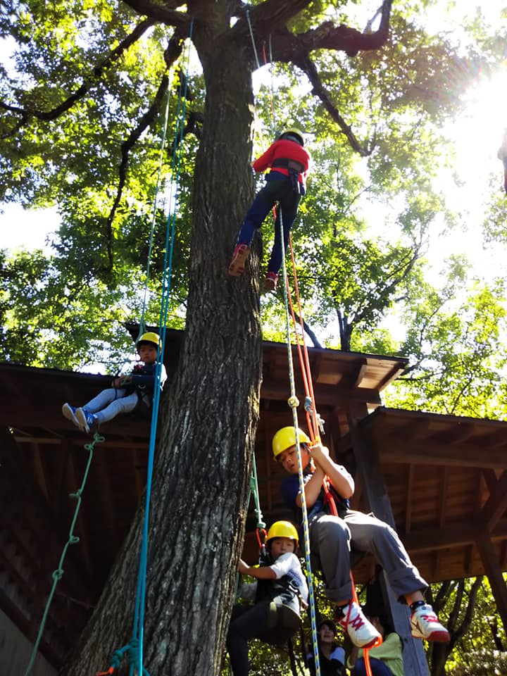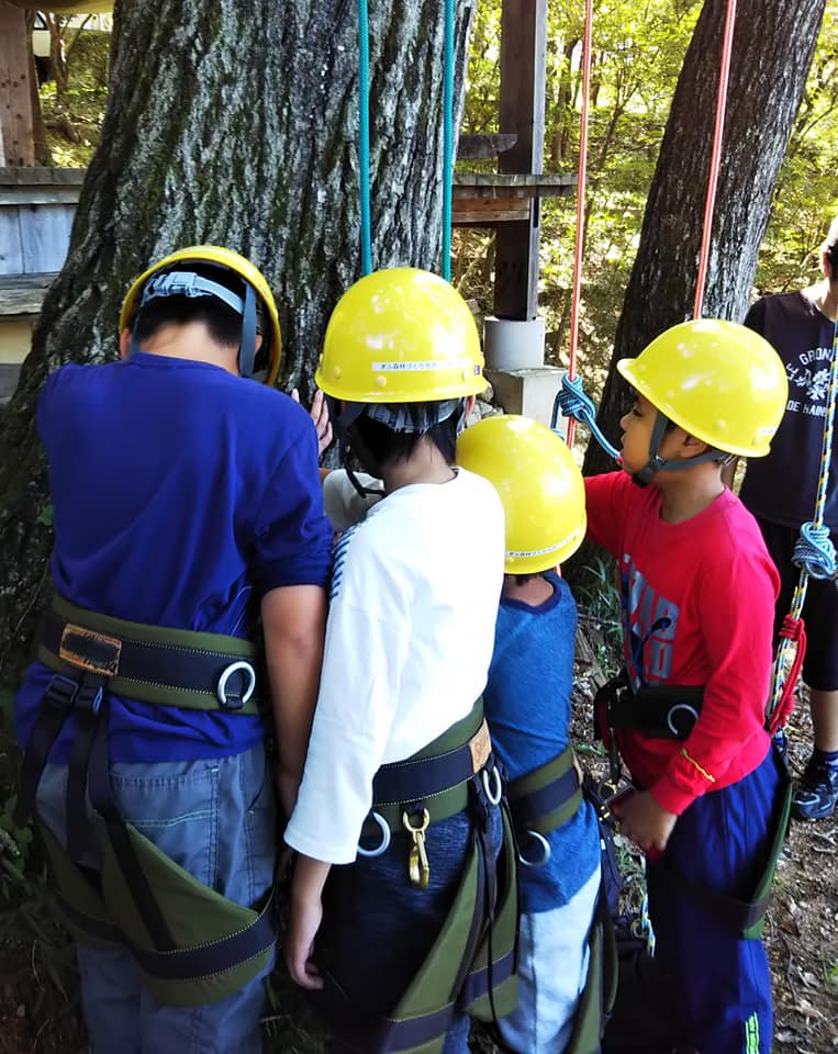 そしてツリークライミングサドルを付けて、いざクライミングです。今回は男の子のグループと女の子のグループの2つに分けて、それぞれ半日ずつ体験しました。