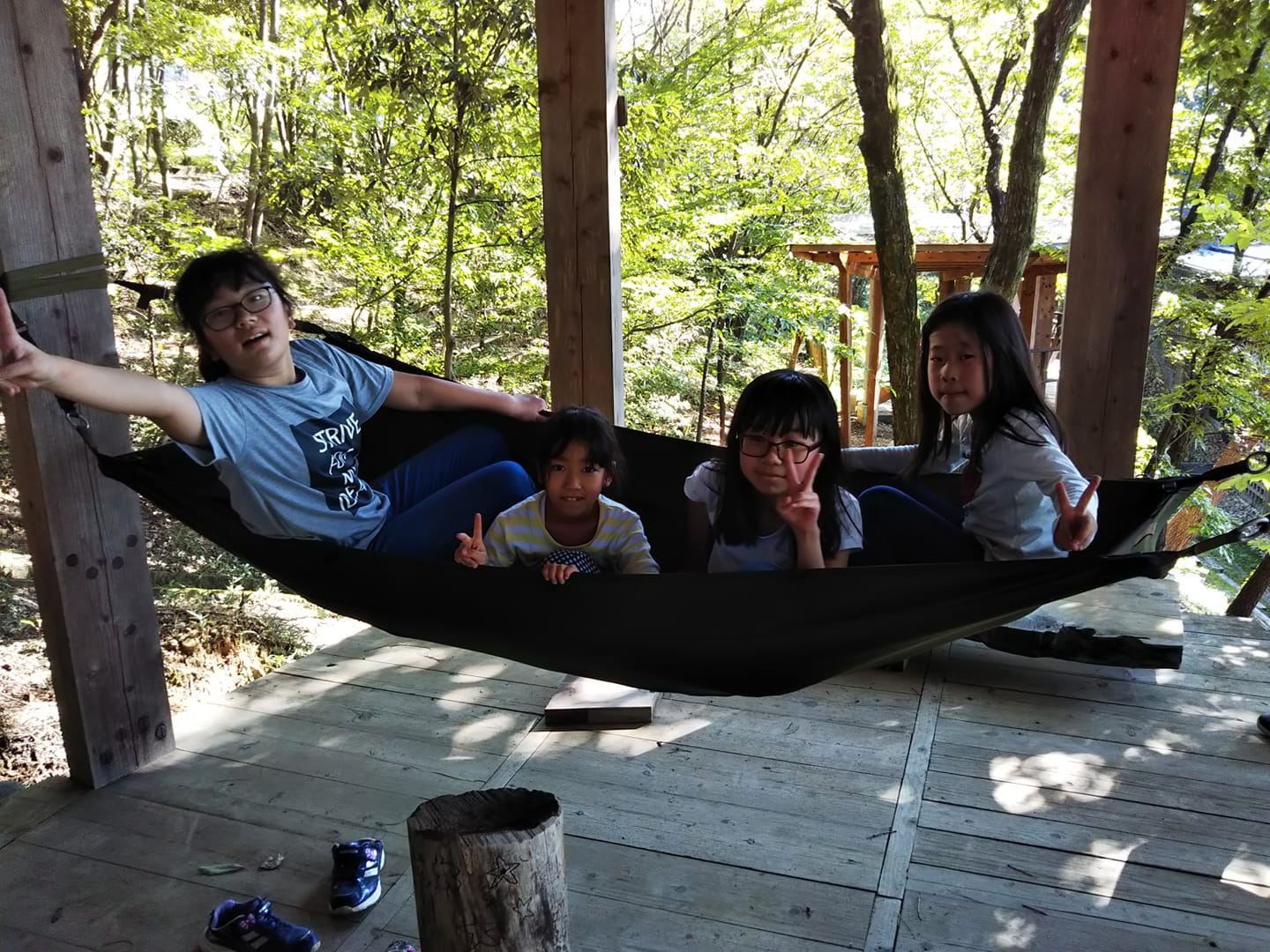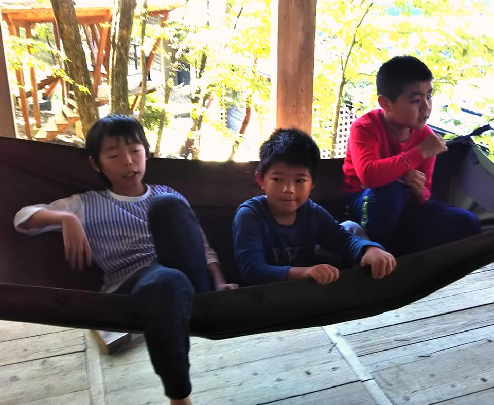 途中、一回クライミングを終えて、ツリーボートでリラックスタイムする男の子たち。