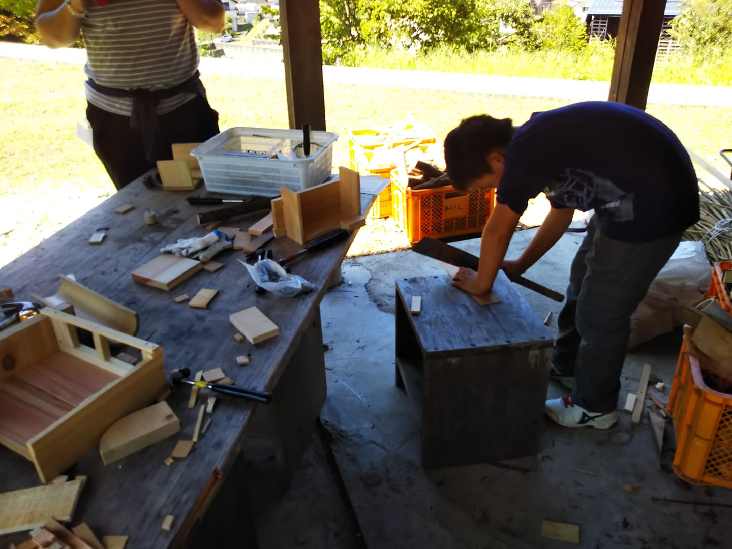 最後に木工工作です。写真のお子さんは自宅にミニカーがたくさんあるので、それを入れる箱を作るのが目的だそうです。