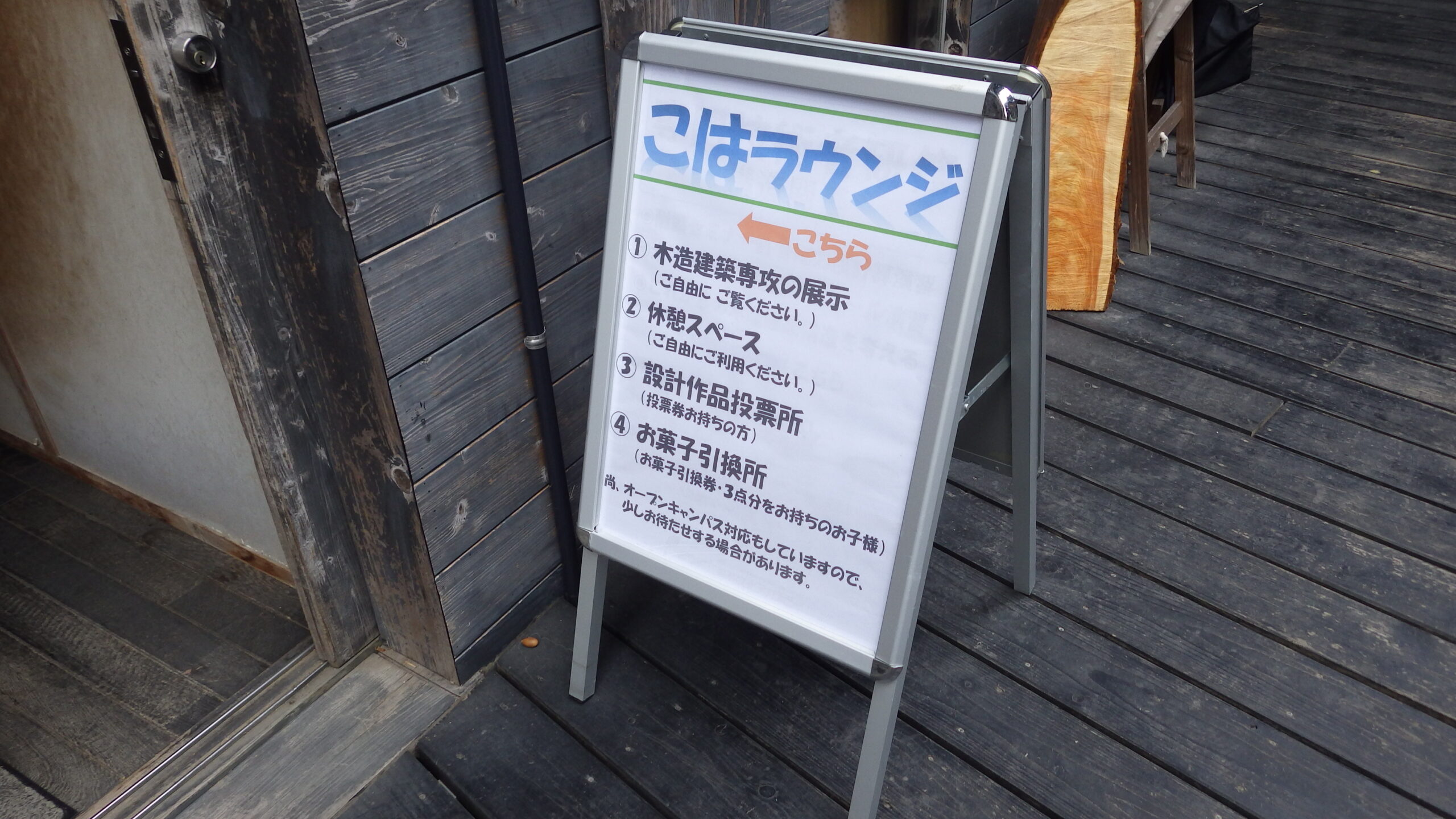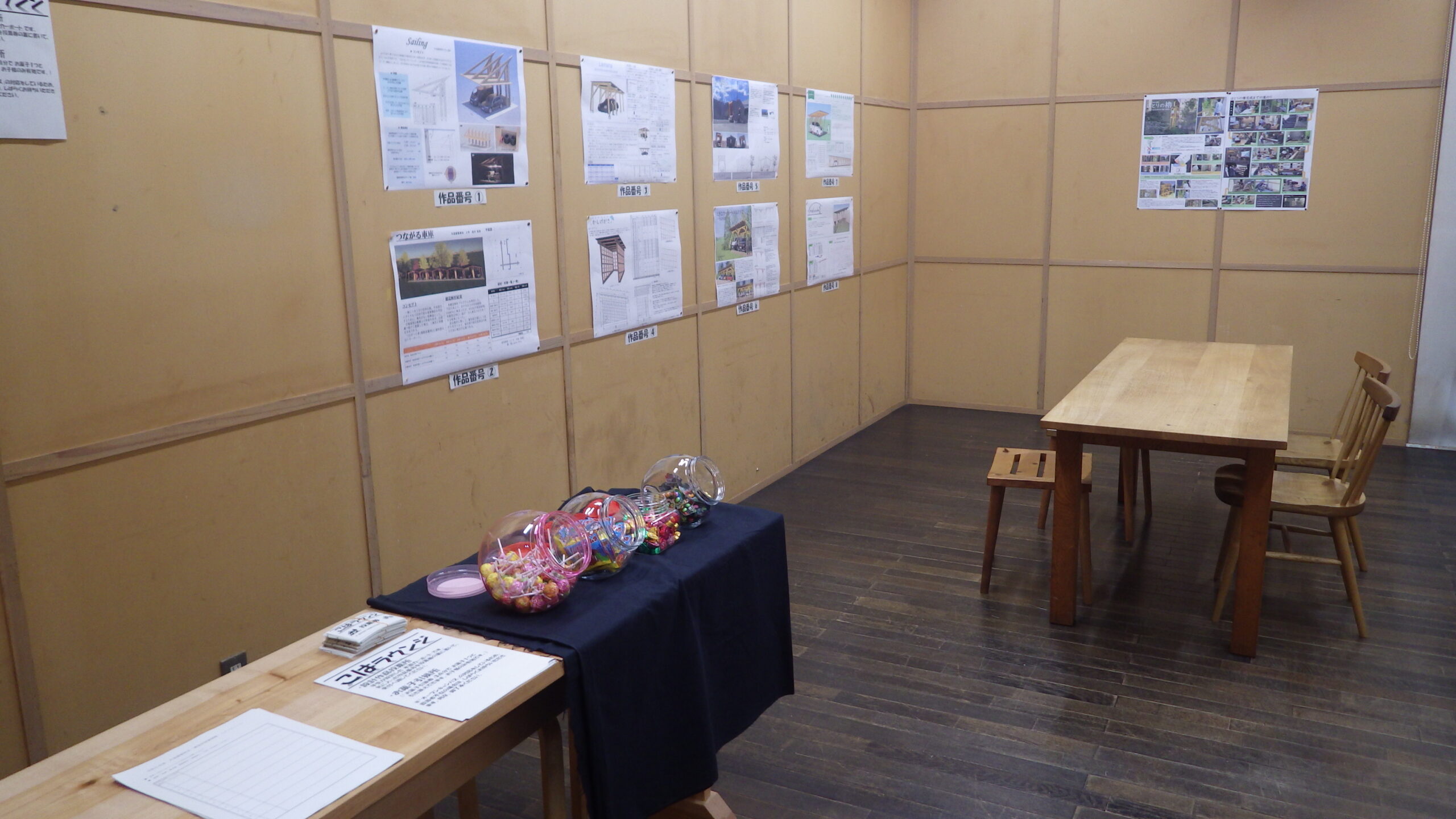 森林文化アカデミー翔楓祭で「こはラウンジ」を開催しました。今年は、アカデミーにおける教育活動や受託研究活動、地域連携活動、学生の自主的活動などをパネル展示および映像展示、さらに翔楓祭来場者による設計作品への投票会などを行いました。毎年恒例のお菓子引換所(こども限定)も行いました。