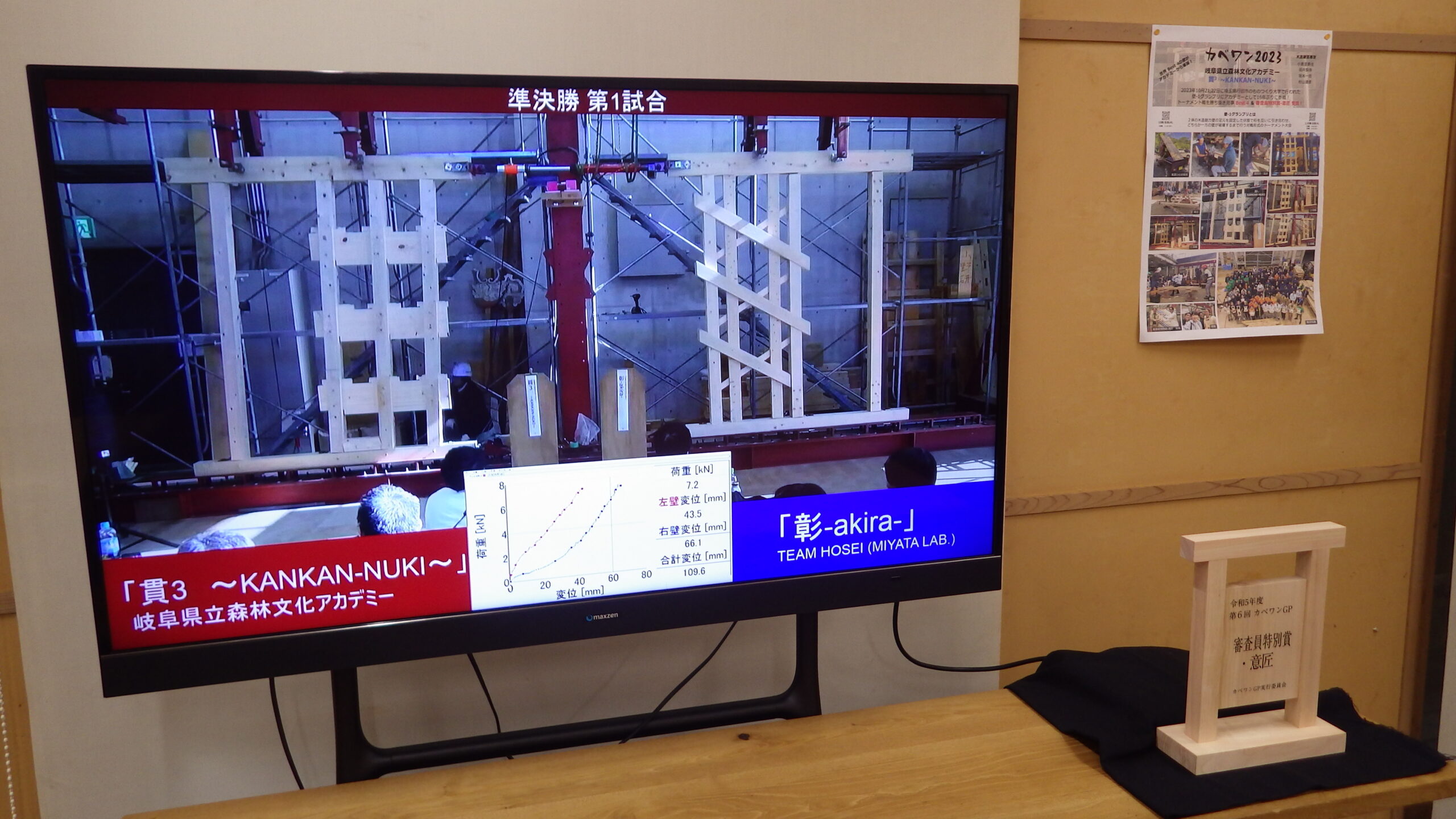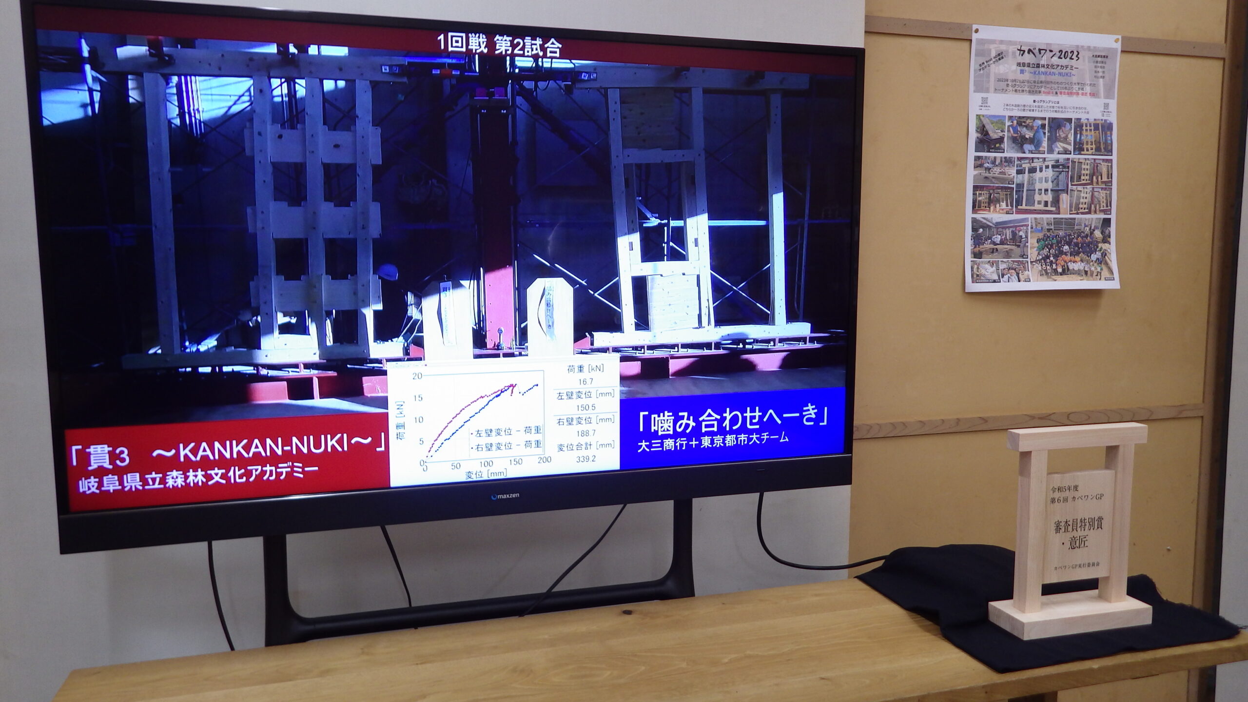 トーナメント戦は準決勝で敗退しましたが、ベスト4入りを果たしました。このベスト4のうち、金物を一切使っていない耐力壁は森林文化アカデミーチームだけでしたので、木材のみでの耐力壁では実質日本一ということになるのでしょうかね?