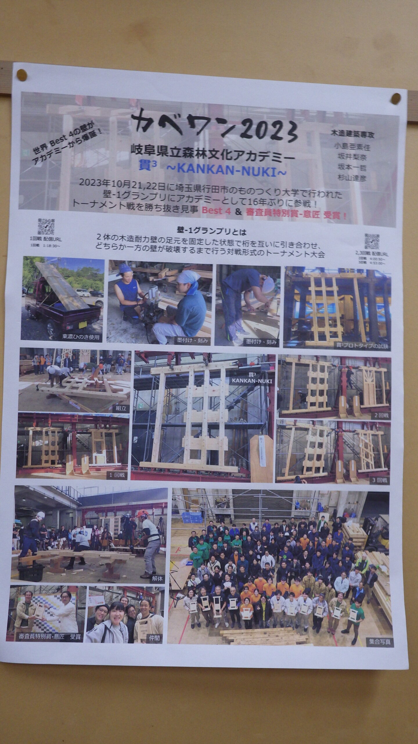 私は、壁ワングランプリの日には、専門技術者研修「これからの木造建築構造を考える」(https://www.forest.ac.jp/academy-archives/wooden_1023/)で、「改正法における木構造で対応すべきこと」を実施していたため会場へは伺えませんでした。この専門技術者研修の記録写真撮影(普段は学生にお願いしているのですが、壁ワングランプリ出場で不在であったため・・・)を岐阜県木材協同組合連合会の方に御協力いただきました。ありがとうございました。