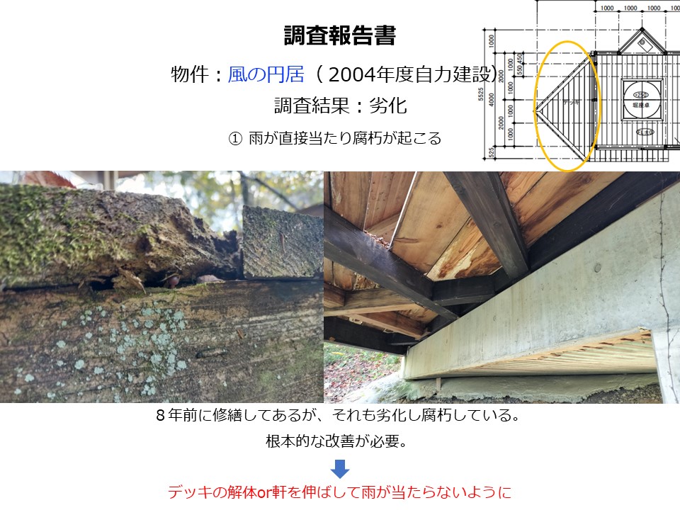 散策路に跳ねだしていたデッキに雨が当たり先端が劣化していました。少し短くなるように切りそろえて雨掛かりを減らしました。
