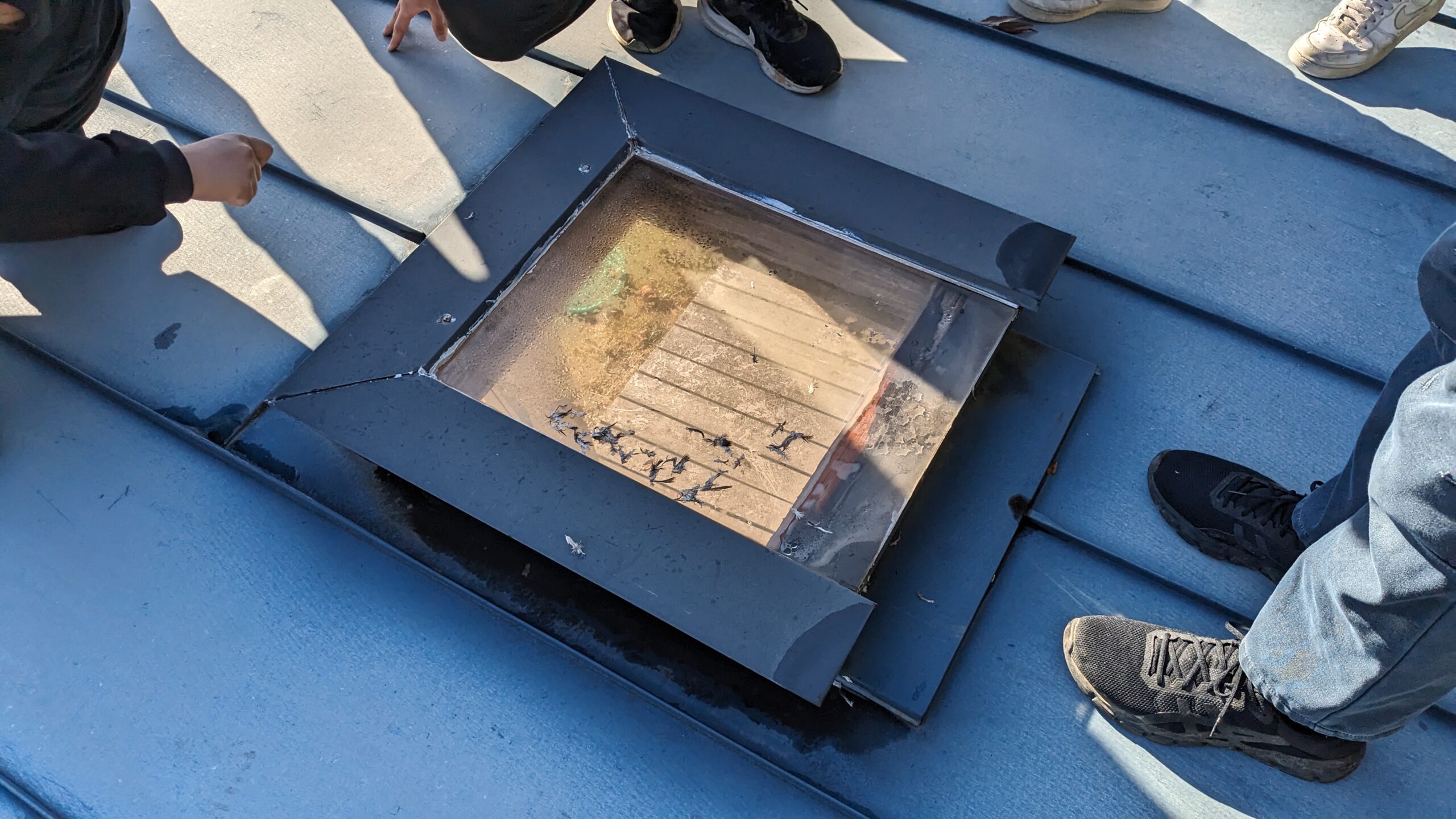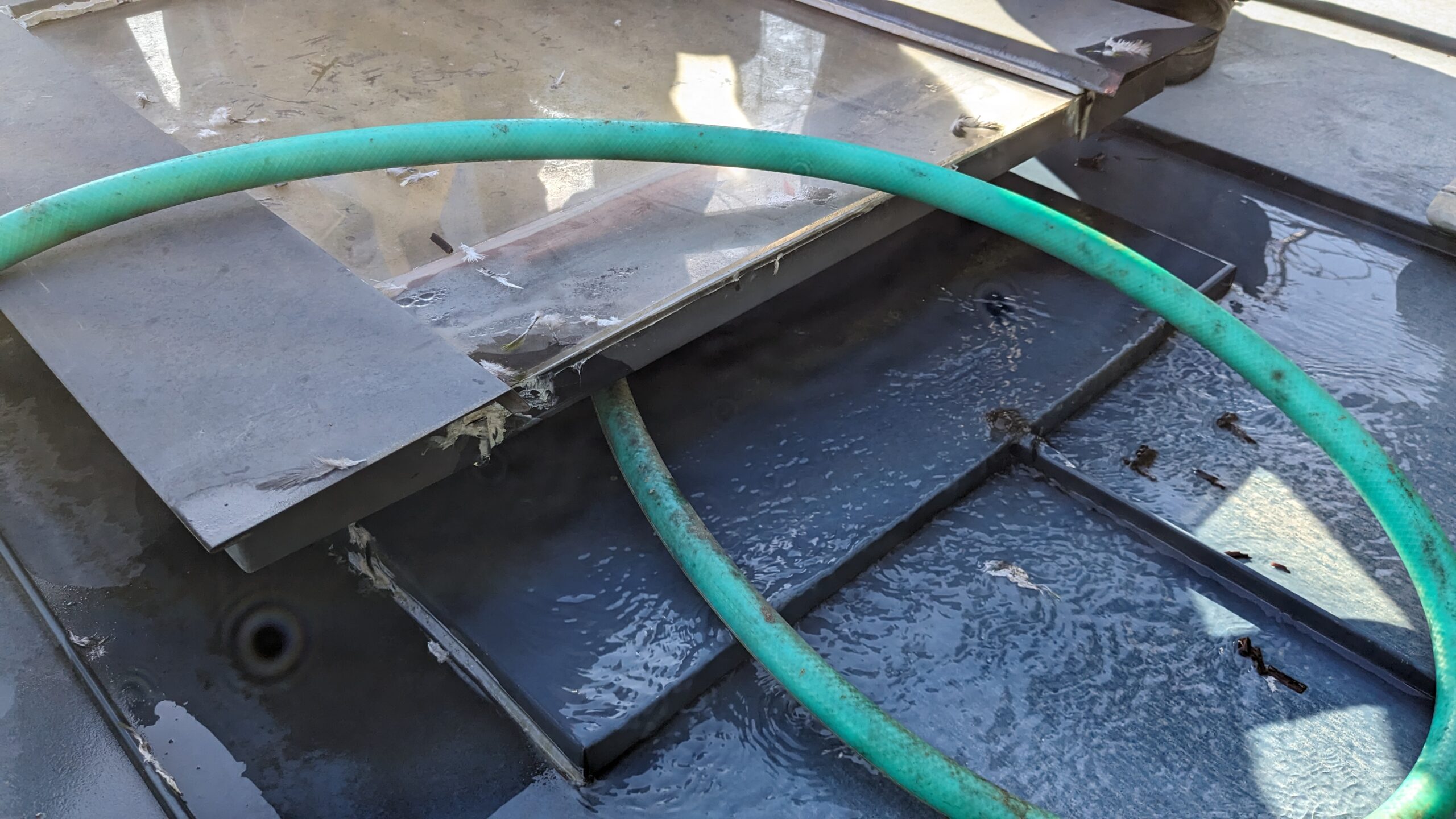 しかも、ポリカーボネイトの板なので、浸入後の水の動きも見れました。右から入った水が、左の方まで拡がって直下以外からも漏出しています。一か所から入って2か所から漏水です。これで、浸入箇所が特定できました。