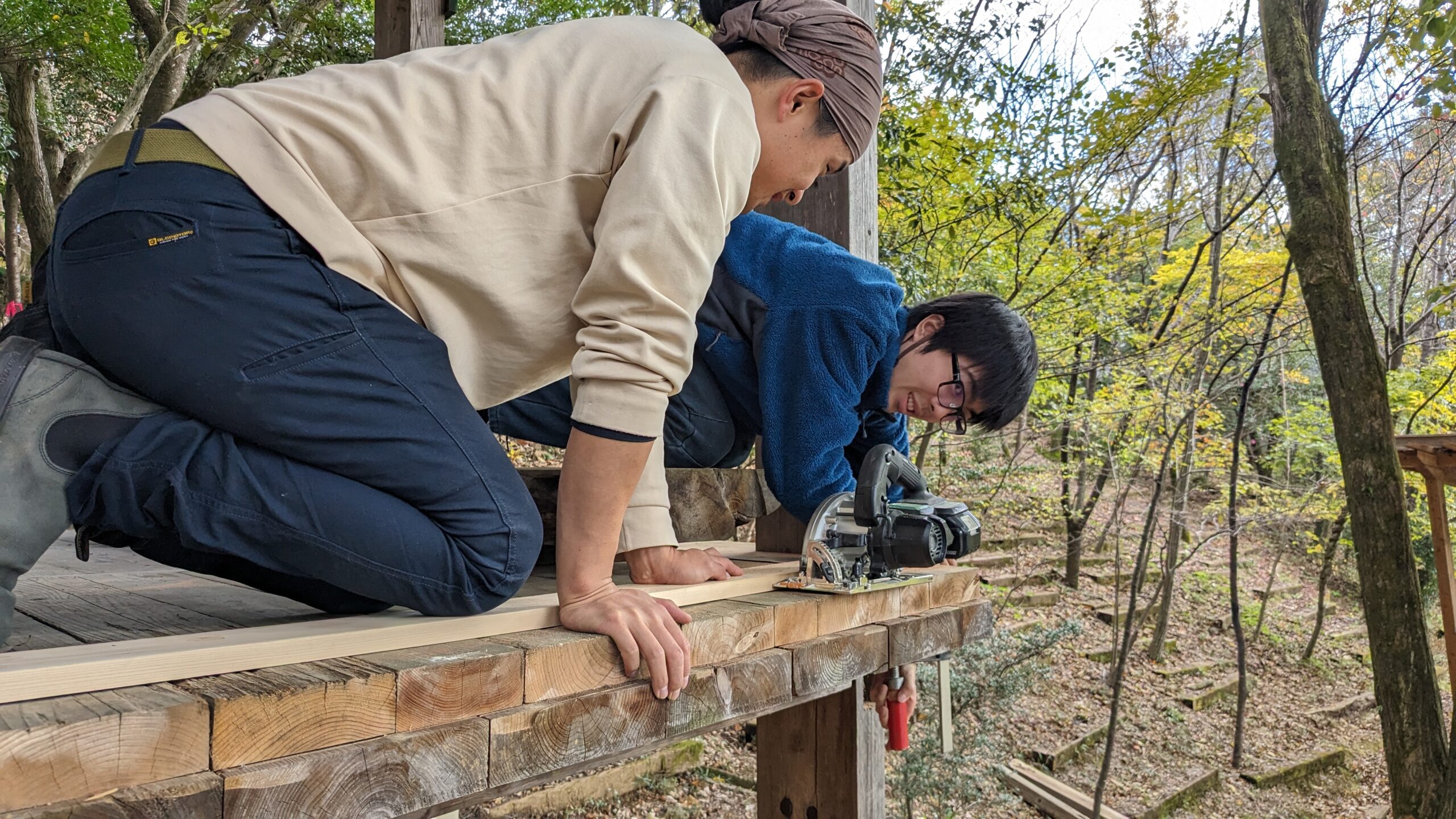 自力建設を体験済みの2年生・クリ科の木造建築専攻とエン科の林産業コースの合同授業です。