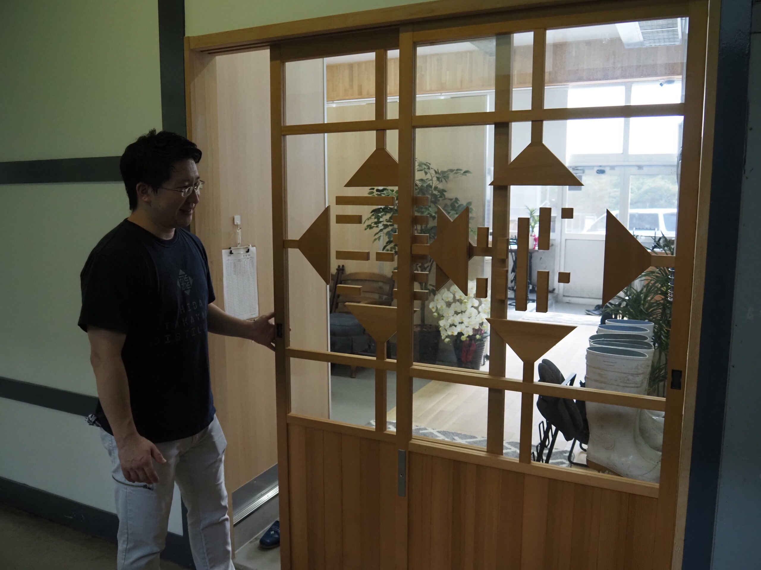 事務室のドアには、開口時にロゴが現れる仕掛けがしてありました。