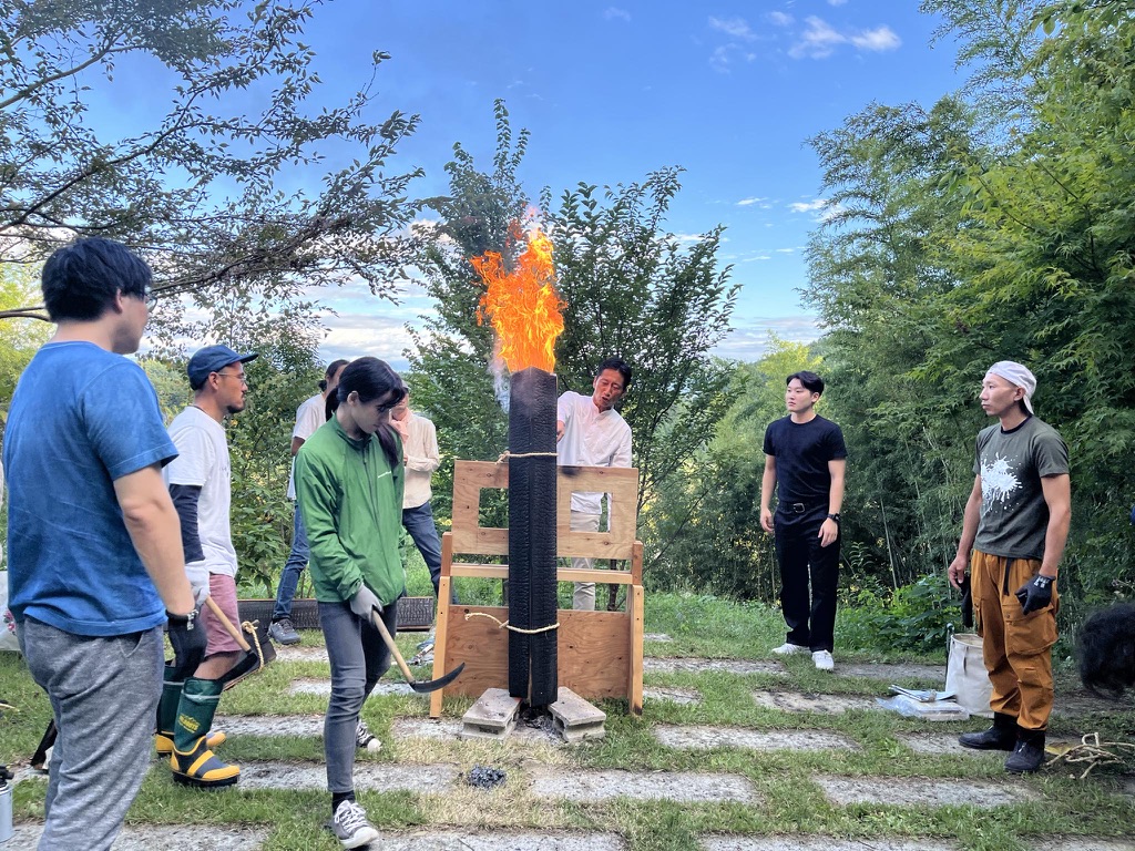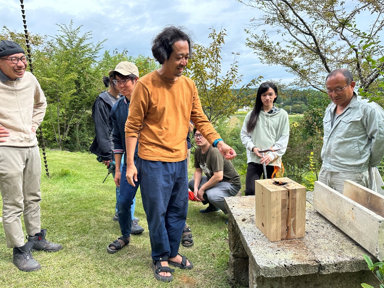 安井先生は、燃焼の三要素から話を始め、縦横の煙突効果を比較しながら、木材の燃焼特性について説明されました。火育実習の現場では、人間の学習特性を踏まえ、直接的な感覚を通じて火の特徴を理解するという方法は、確かに非常に有効だと感じました。先生が推奨された視覚、嗅覚、聴覚、触覚に加えて、私は味覚も試し、杉の炭化後の味を確かめてみましたが、少し酸味がありました。