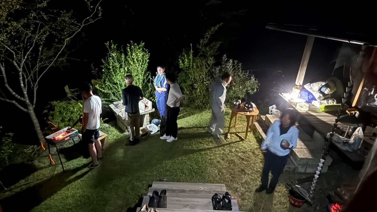 焼杉のスモークの香りをまとい、八ヶ岳の温泉に行きました。その後、火育のもう一つのプログラム「火育×料理」が始まりました。今年は、安井先生方が準備された料理に加え、1年生、2年生、そして教員たちもそれぞれ一品ずつ料理を用意していました。