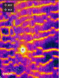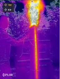 現場にいない皆さんも、可視化された温度情報を通じて、3枚の杉板の外部と内部の温度差を確認することができます。(左側の温度情報は正確ではありません。炎が吹き出す位置は800度を超えており、機器の測定範囲を超えていましたが、相対的な関係は参考にできます。右側の温度は正確で、燃焼停止1分後、木節部分や溝の位置で温度がより高いことを示しています。