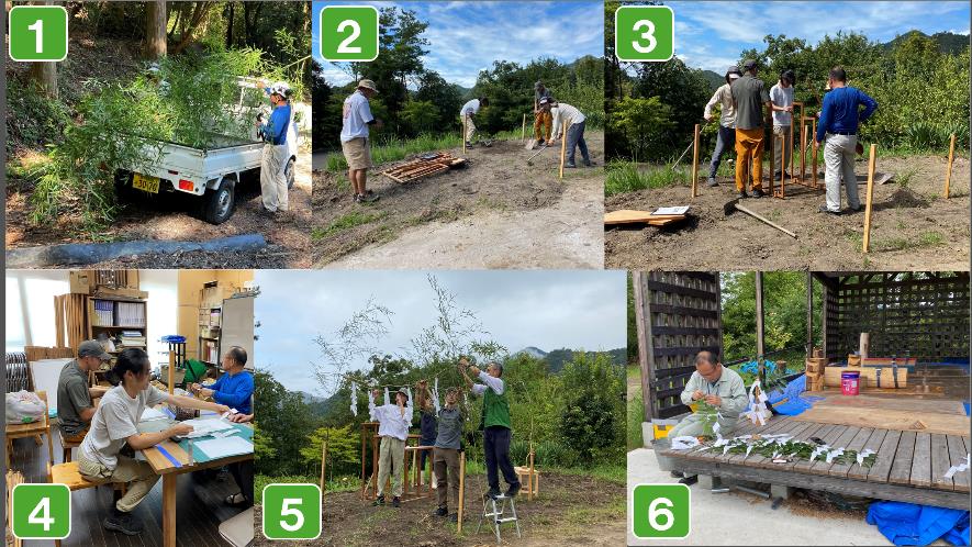 山へ竹を刈りに行き(1)、建設地を地均しし(2)、祭壇を組み盛砂を作り(3)、紙垂を手作りし(4)、敷地の四方に青竹を立て、しめ縄を張り(5)、玉串となる榊に紙垂を取り付け(6)、お供えを整え、道具を揃えて