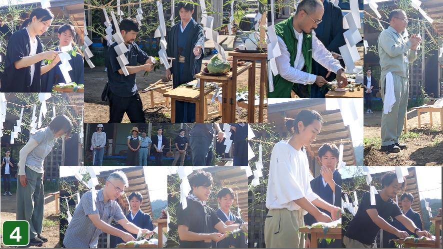 雅楽が流れる中、神職に続き、想定施主の渡辺先生、棟梁の銭氏(設計担当役)、増岡氏(施工担当役)が入場し(1)、関係者が集まります。神職による祝詞奏上、四方祓いの儀(2)、地鎮の儀(3)、玉串奉奠(4)など、一連の流れで、こちらが驚くほど立派な儀式を執り行っていただきました。