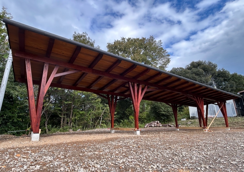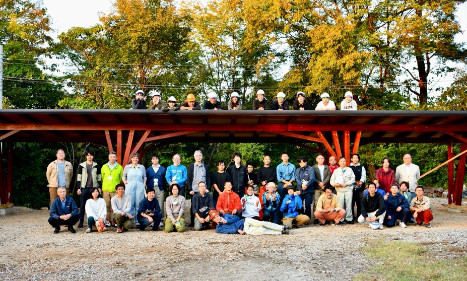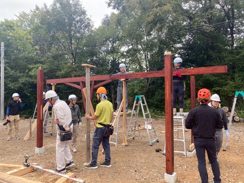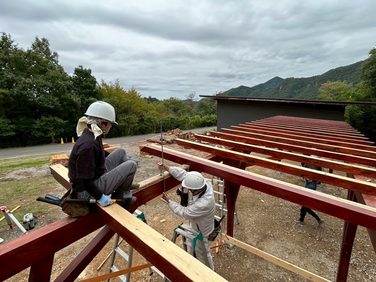 「紡木人」の建設作業はこの後、屋根板金のふき付けや壁と棚の設置などが残っています。最後まで気を抜かずに、心地よい空間でチェーンソー練習が行えるよう、木造建築専攻1年生一同、力を合わせて頑張っていきます!