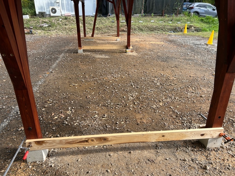 また、「紡木人」の柱は8本中6本を「Dボルト」という金物を使用して基礎と緊結させます。最終的な緊結作業は構造材を組み上げた後にモルタルを注入して行うため、「建て方」の作業中は常に構造体の足元が不安定な状況になります。この点についても、大工さんの知恵で板とクランプを使って構造体の足元を固定することで課題をクリア。初日の作業で柱と桁、方杖をほぼ組み上げ、建物のフレームが完成しました。