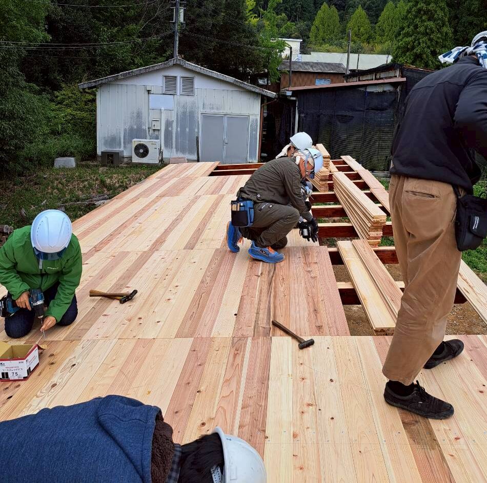 2日目は、登梁を桁に乗せてビスで固定し、屋根の野地板(幅120mm、厚さ30mm)を敷く作業に取り掛かりました。「紡木人」は屋根部分が広いのが特徴で、用意した野地板は約300枚。実(さね)加工した板を一枚一枚はめ込み、ビスで固定していきます。大工さんの手早い作業に圧倒されながらも人海戦術で次々と板を打ち付け、防水シートの「アスファルトルーフィング」を敷いてこの日の作業は終了です。