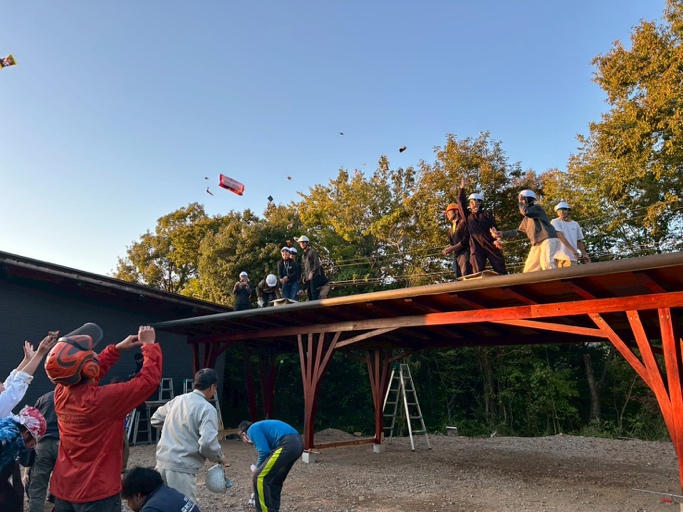 自力建設「紡木人」。ついにその姿を現す。上棟を「菓子まき」で祝う!