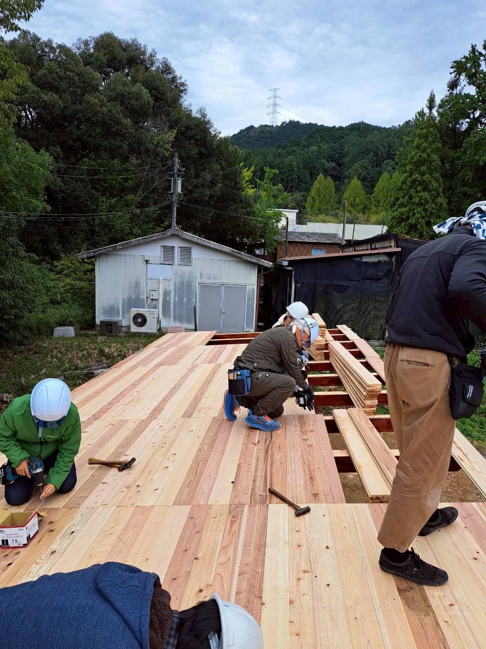 2日目は、登梁を桁に乗せてビスで固定し、屋根の野地板(幅120mm、厚さ30mm)を敷く作業に取り掛かりました。「紡木人」は屋根部分が広いのが特徴で、用意した野地板は約300枚。実(さね)加工した板を一枚一枚はめ込み、ビスで固定していきます。大工さんの手早い作業に圧倒されながらも人海戦術で次々と板を打ち付け、防水シートの「アスファルトルーフィング」を敷いてこの日の作業は終了です。