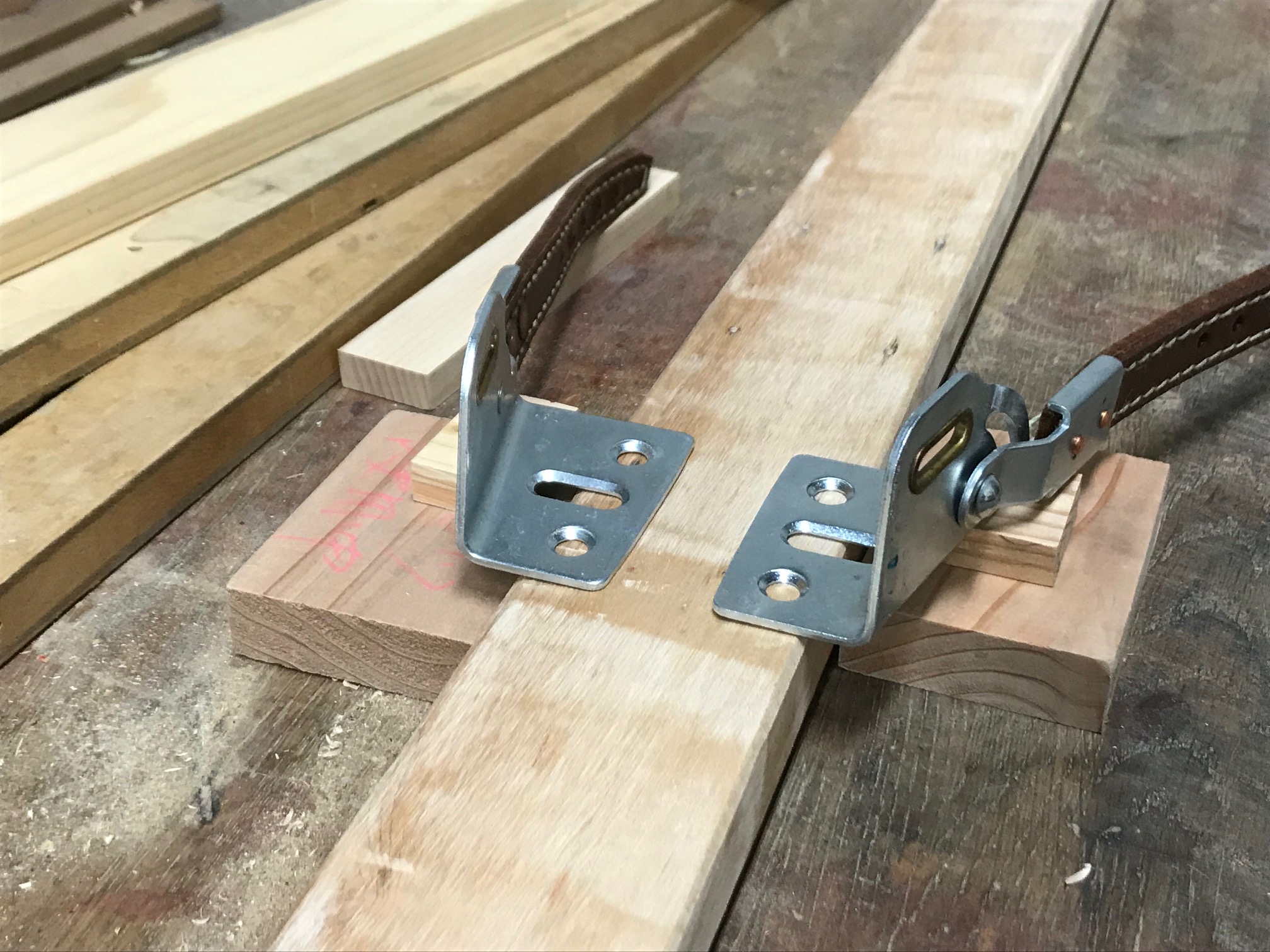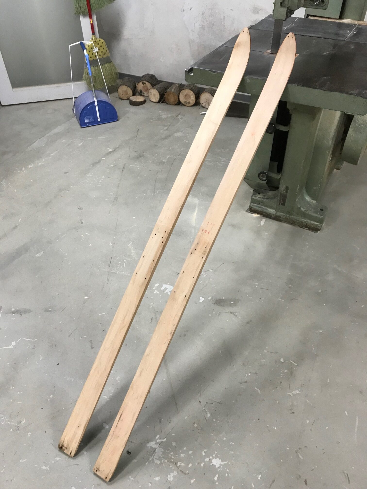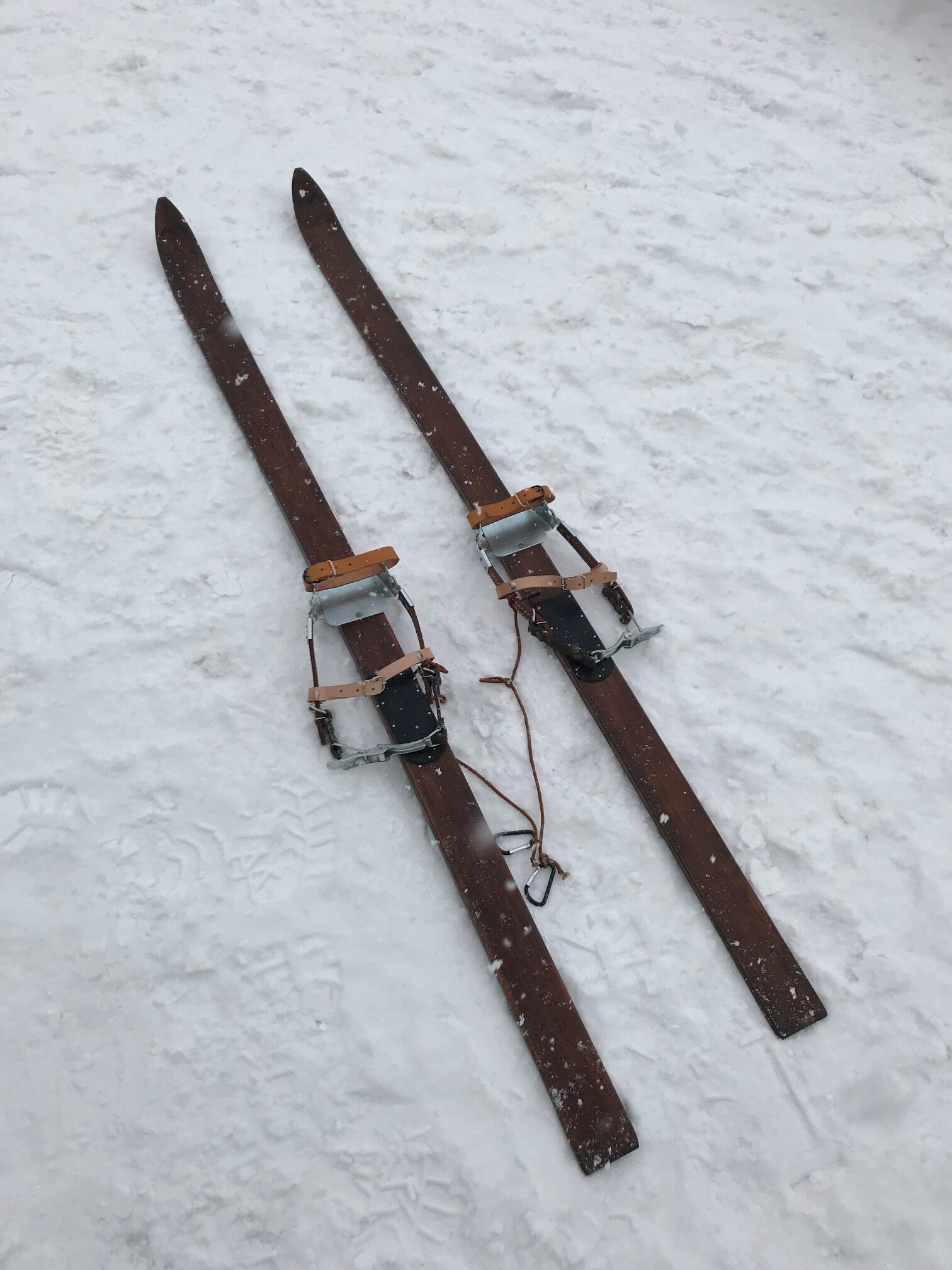 ビス跡や劣化部を埋め木で補修し、ニスを塗り、新しいバッケン(ビンディング)を着けて「歩くスキー」に現役復帰させました。