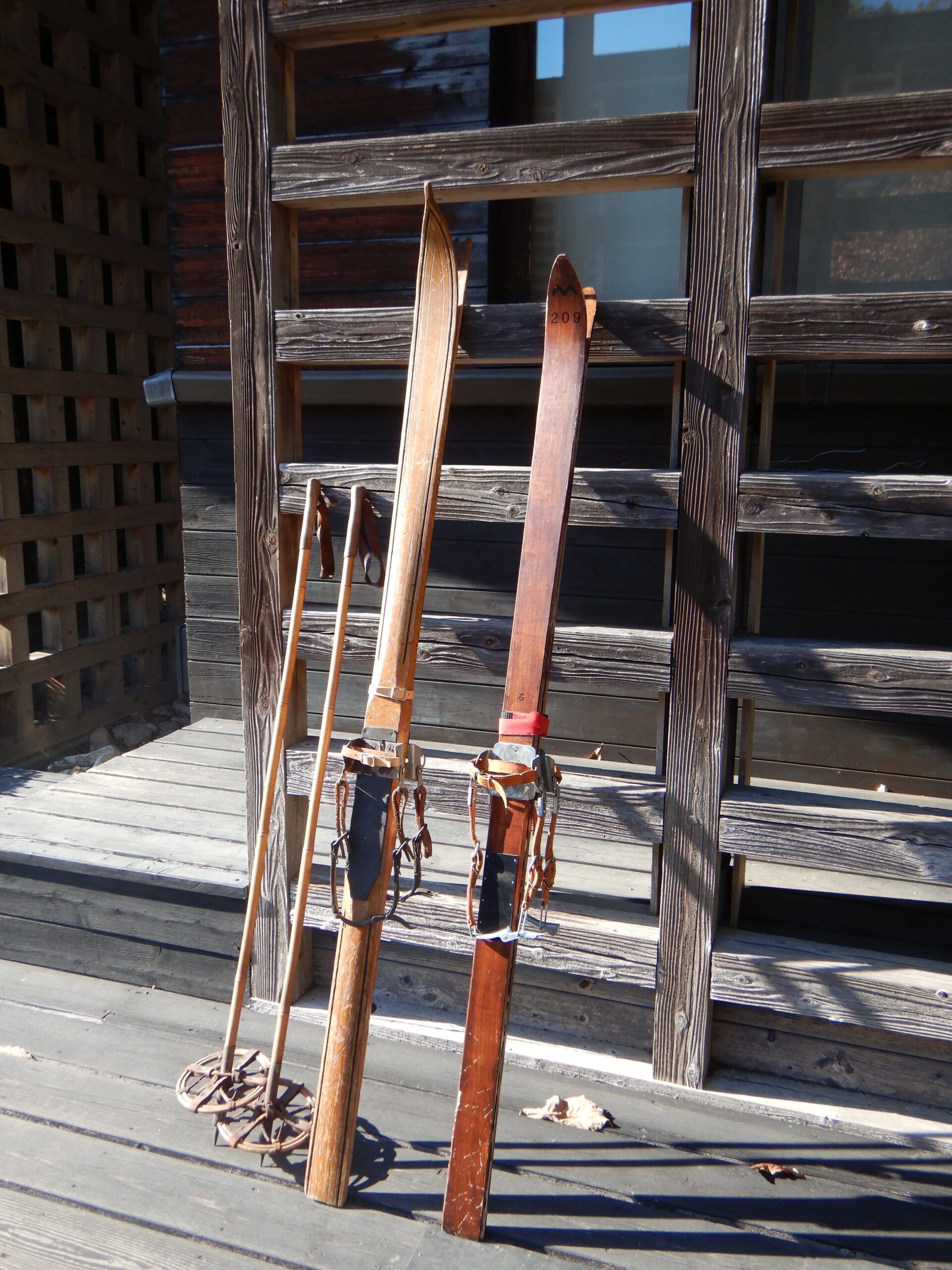 左側は大正~昭和初期ごろの国産品とみられる単板スキーで、ヤチダモが使われています。