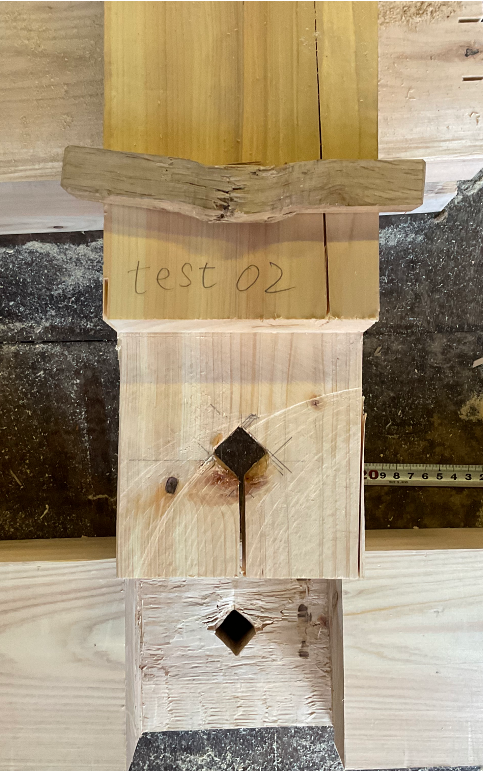 込栓の寸法や材質を変えて試験を行い、込栓がせん断したり、ホゾが割れたり。