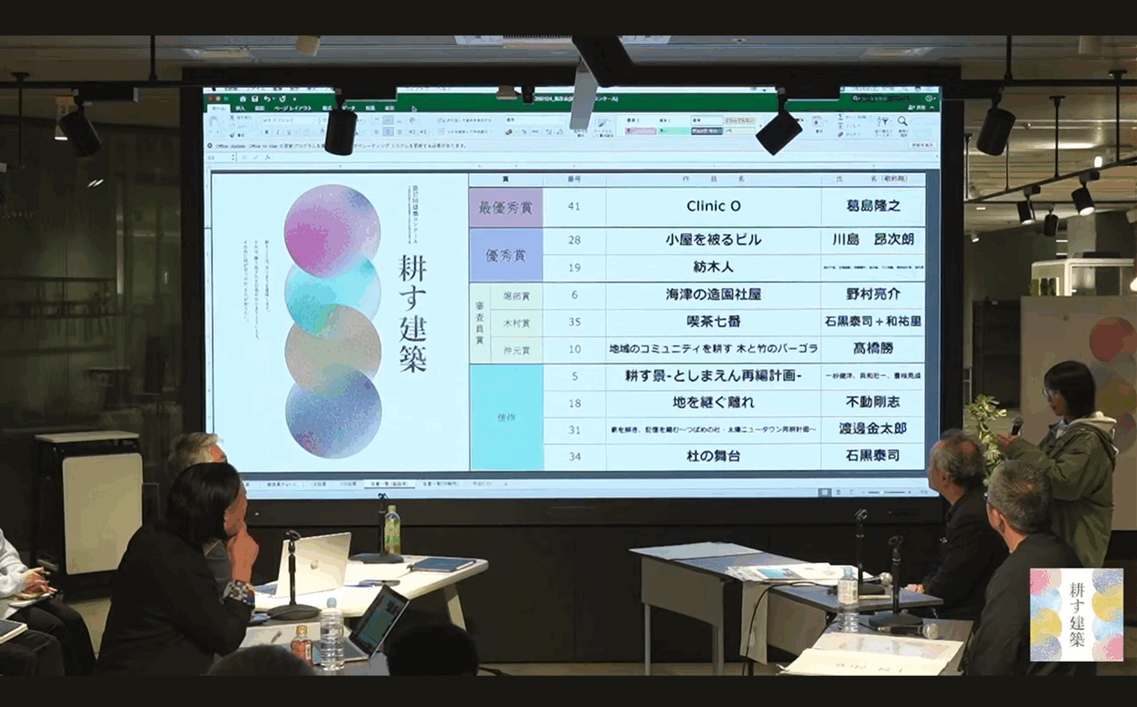 「耕す建築」の審査員は建築家の堀部安嗣さん、建築家の木村吉成さん、茅葺師の沖元太一さんで、審査前にはパネルディスカッションが行われました。フェイクが溢れる時代に自分の身体感覚に誠実な五感・六感がはたらく設計、文化なき創造はないといった話もあり、今生きる中で感じる違和感や求めているものがなんだかすっと、ときにはぐさっと言葉で入ってくるような感じがしました。