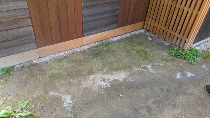 地面が少し削れて、跳ね返りが建物を汚しています。湿気の影響でコケも少し見られます。