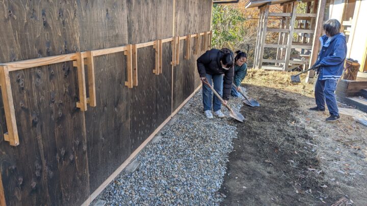 ●24期「栞」の雨水の跳ね返りは、周辺を少し削り砂利敷きで抑える対策としました