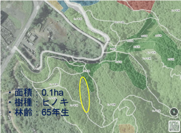 皆伐地は面積0.1ha、樹種ヒノキ、林齢:65年生のヒノキ林になります。アカデミー演習林の詳細な情報は演習林GIS「morivis」で見ることができます。