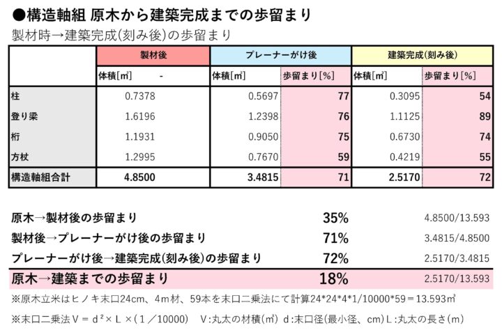 これらの結果から、幹部分(立木時)から構造軸組部分(建築完成時)になった歩留まりはおおよそになりますが、