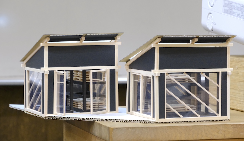 ラーメン構造という架構で耐震性能を、壁面3面と屋根から集熱する温熱性を担保した上で、造形を2019年自力建設Cobikiに寄せて、コンセプチュアルなまとめとなりました。模型もわかりやすくつくり込んでいますね。
