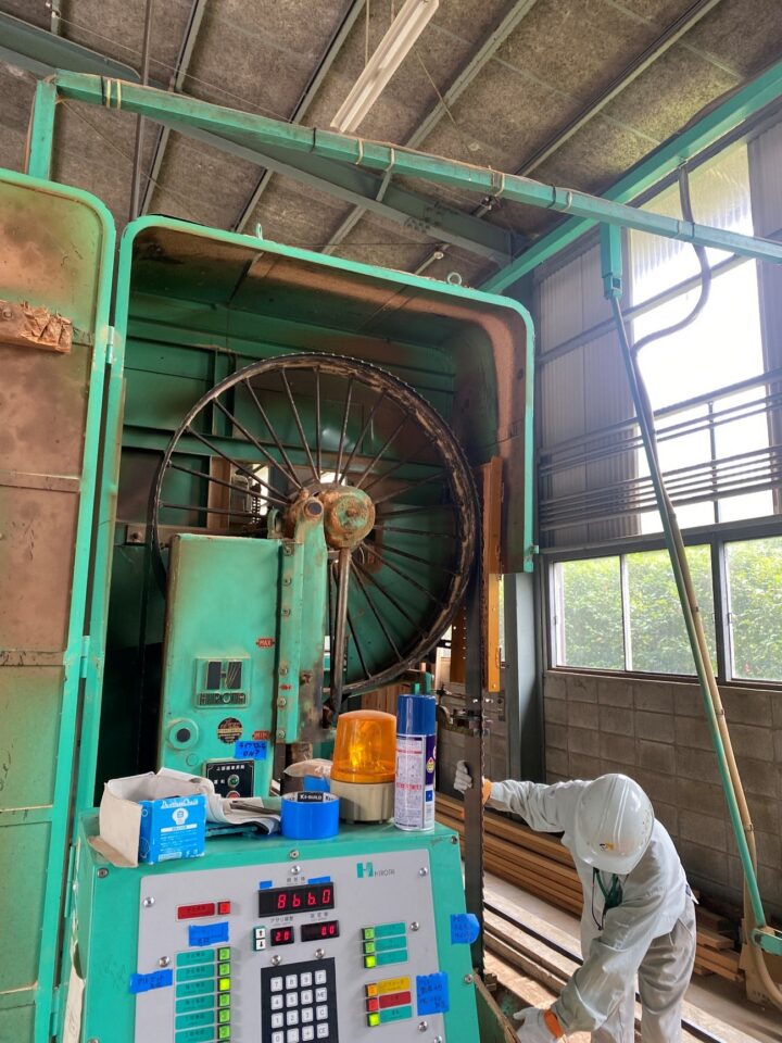 製材機械の仕組みについて。刃に問題がないか、作業前点検は欠かせません。この帯鋸には205個もの刃がついています。目立ては業者に出すことが多いですが、大型製材工場では5~6人の目立て職人さんがいるとのことでした。チェーンソーでさえ四苦八苦している私は、目立てという精細な作業を日々されている職人さんに心から尊敬の気持ちが芽生えました。