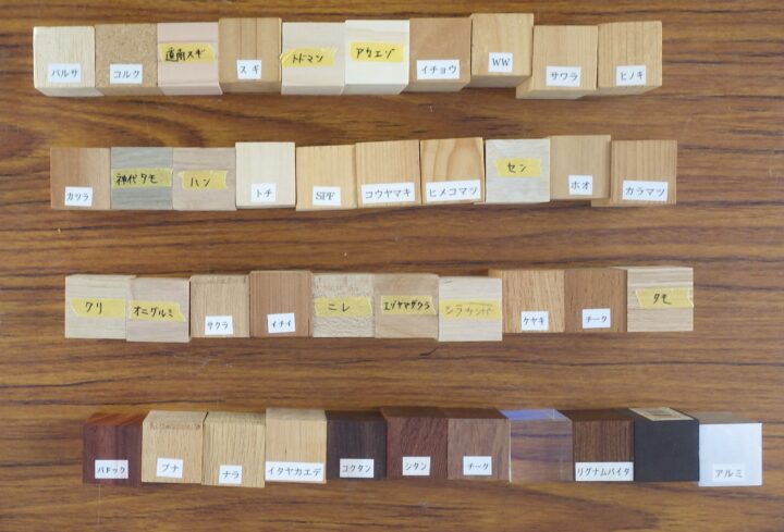 使用した木材を重さ順に並べてみました(木材じゃない素材も何個か混じってますが…)。