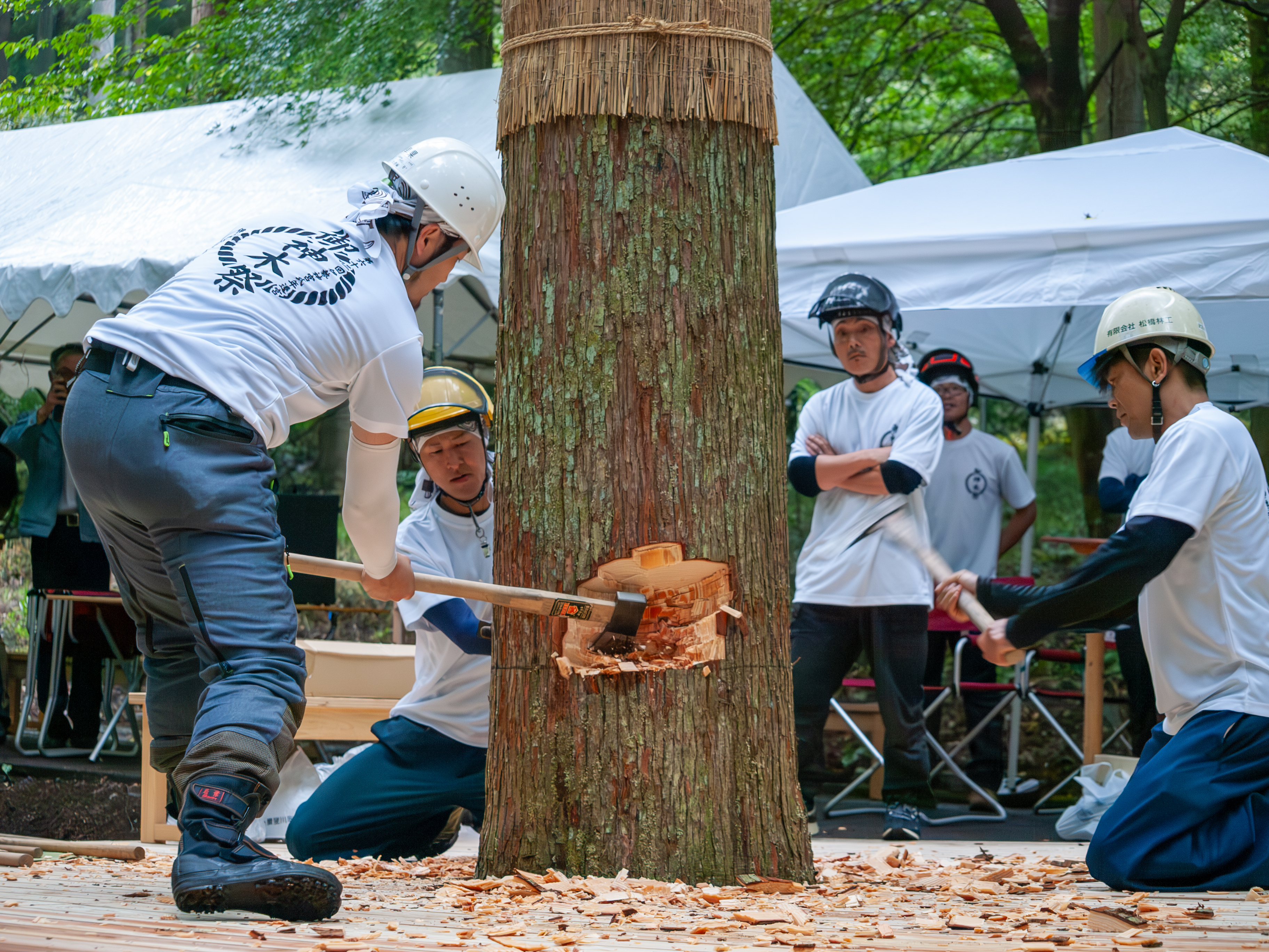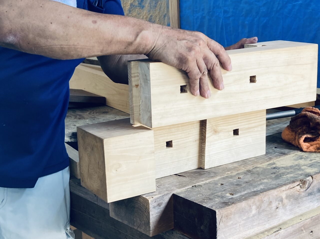 ほぞ穴とほぞ、仕口を合わせ、両方向から掛矢(かけや)を使って打ち込みながら、材同士の噛み合わせを確かめていきます。