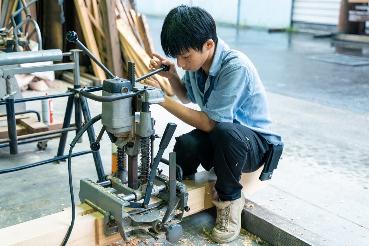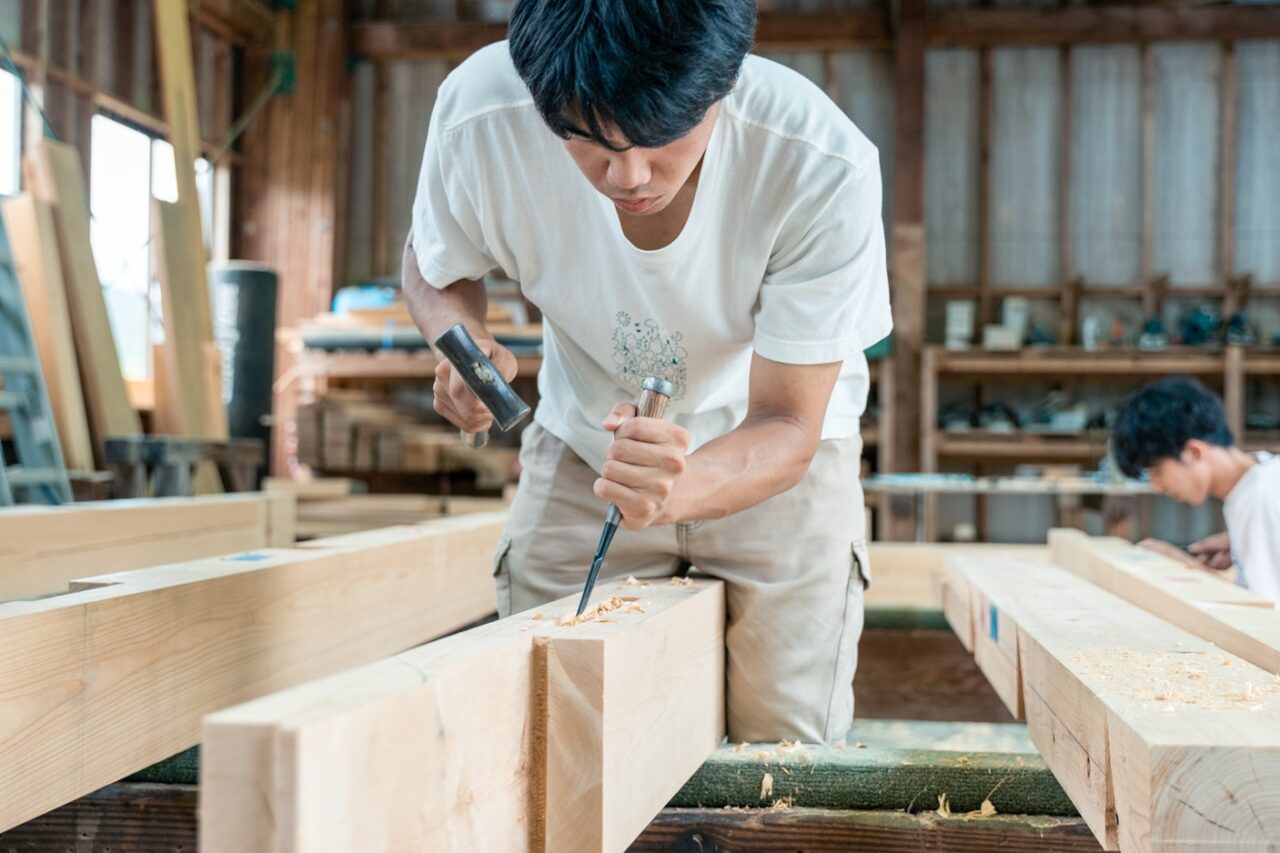 刻み作業では、丸ノコや手ノコ、鉋(かんな)、鑿(のみ)、玄能(げんのう)などの道具を使い、前回の墨出しを頼りに継ぎ手や仕口を正確に加工していきます。