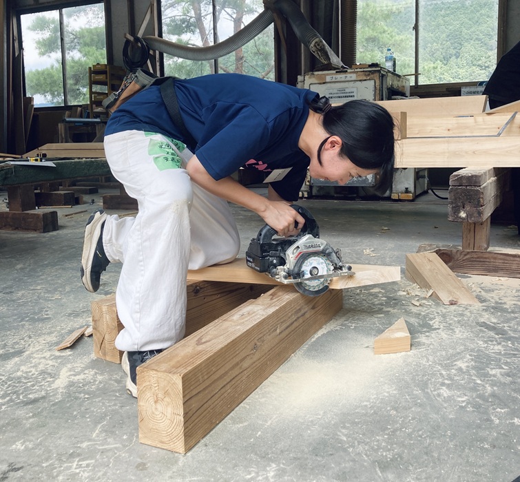 合計32本ある方杖の刻みは、すべてが斜めの加工となります。初めて使う丸ノコで、フリーハンドによる刻みに挑戦するという、ある意味チャレンジングな体験となりました。