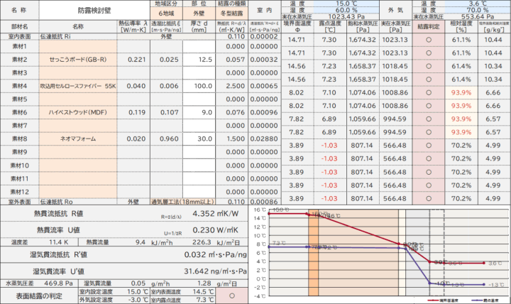 そこで素材構成から定常計算を行い、結露のリスクを判定できるツールを公開します。