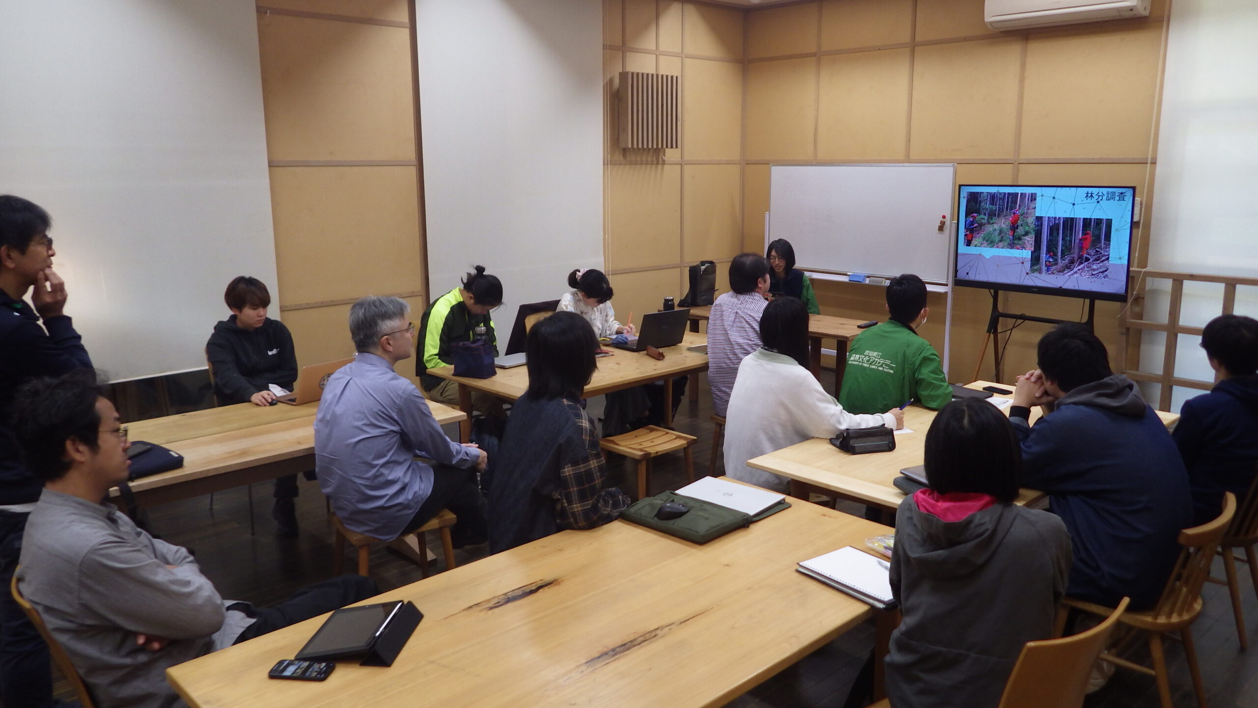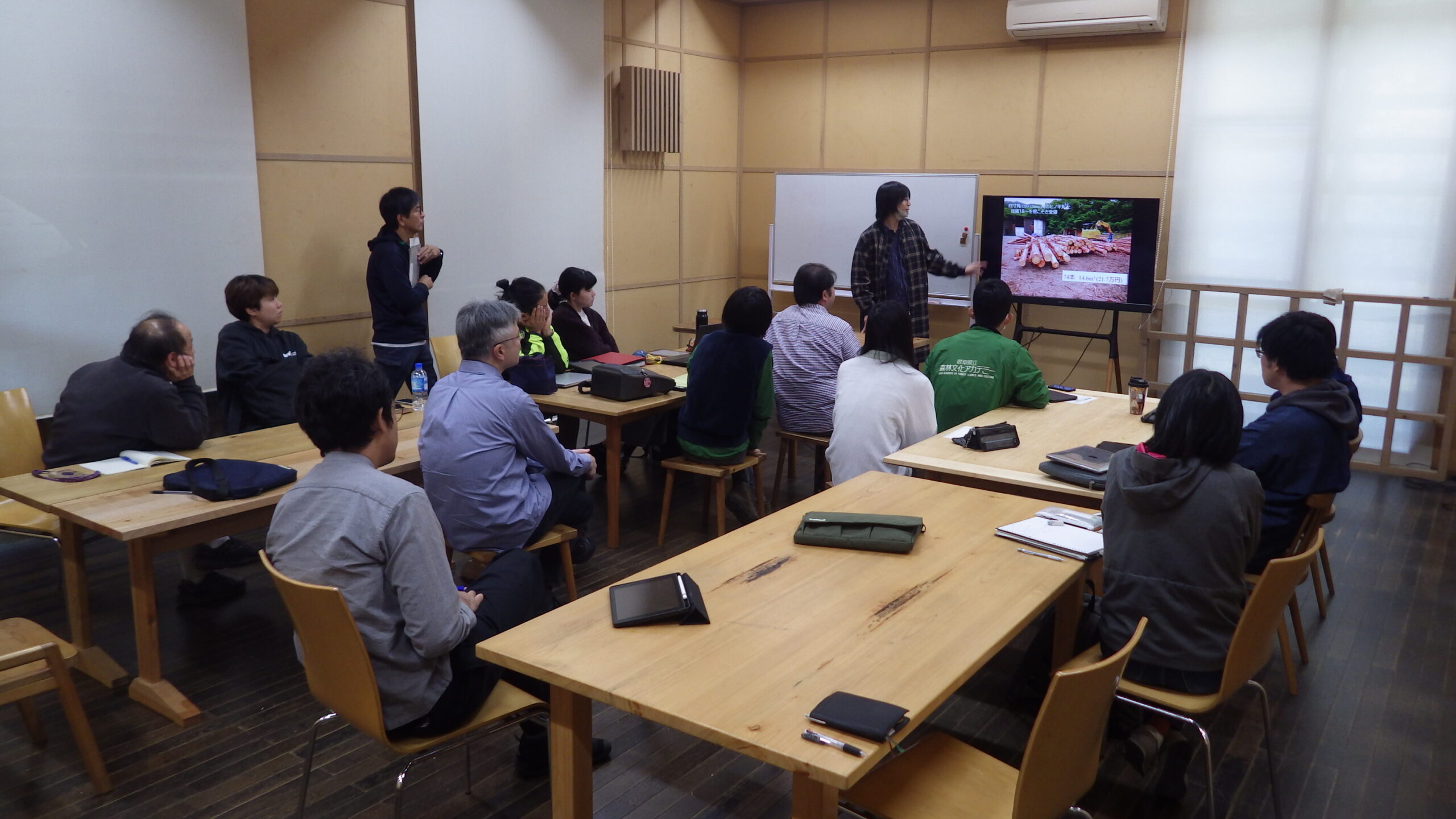 林業専攻の学生から出材量とその販売価格について、立木時の予測値と市場販売時の実際の数値の比較検討の報告がありました。木造建築専攻の学生からは自力建設における丸太から製品に関する一連の作業について説明がありました。上田先生からは木材の製材、乾燥に関して説明がありました。