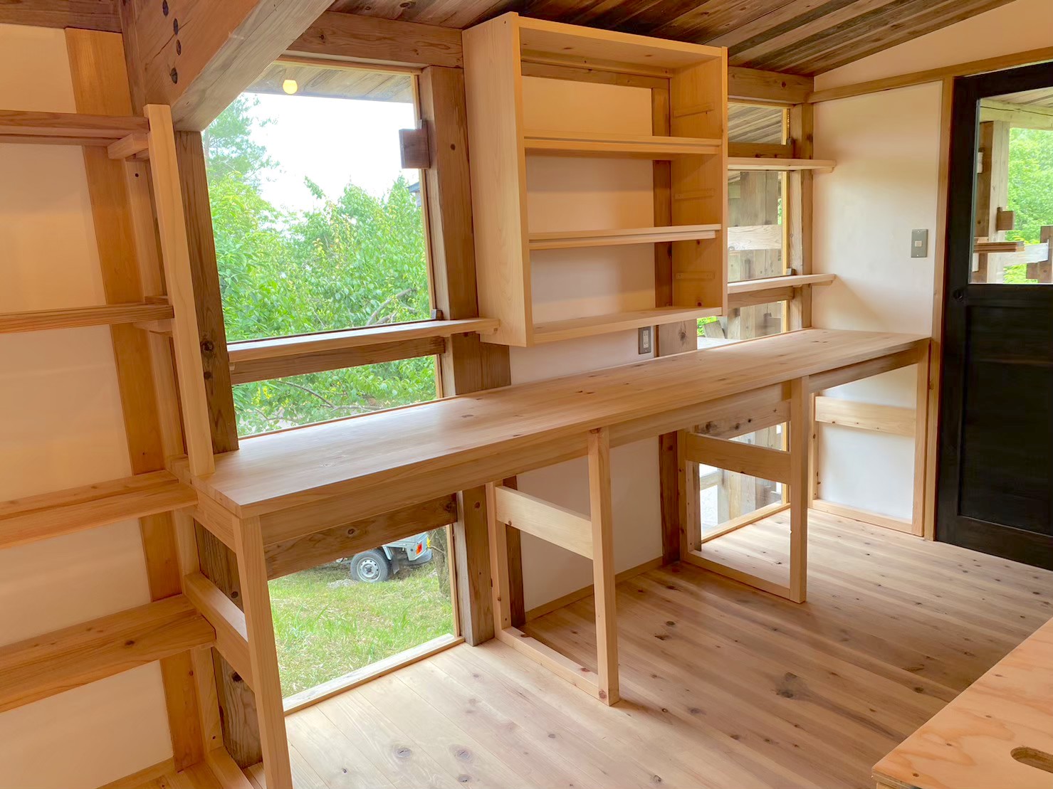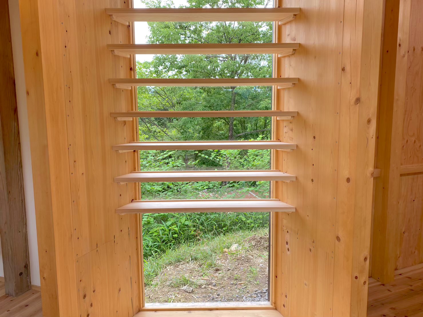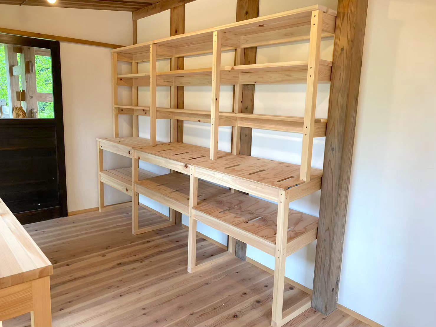濡れたコンテナを置いたとしても大丈夫なように、棚板に杉の赤身をふんだんに使用しました。